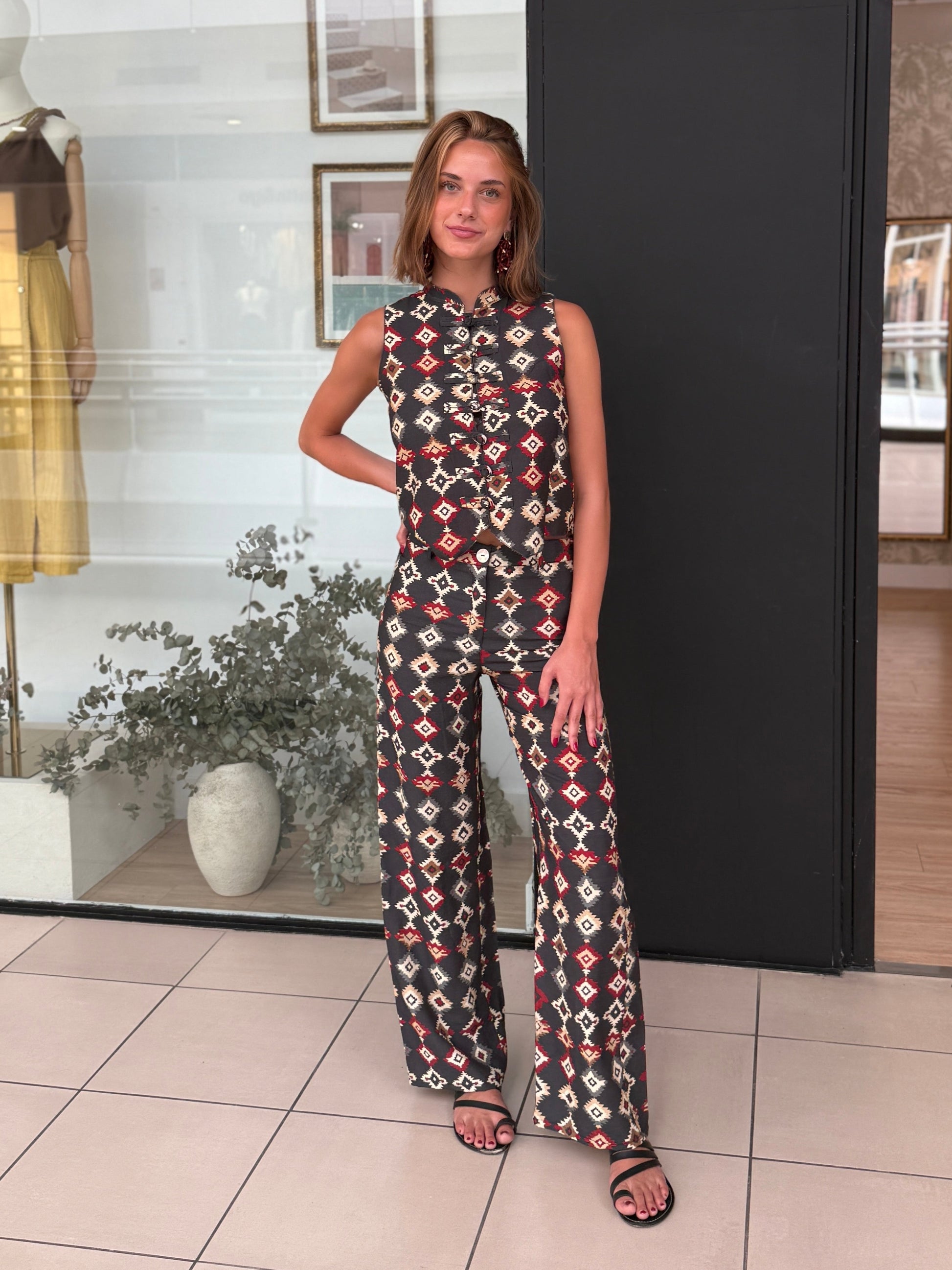 Camisa en forma de chaleco con cierre de nudos y cuello mao. Con un tejido súper fresquito a juego con nuestro pantalón Cíes. Ideal par hacer el total look o para combinar con tus jeans preferidos. Con un estampado único de edición litada. Disponible en varias tallas.