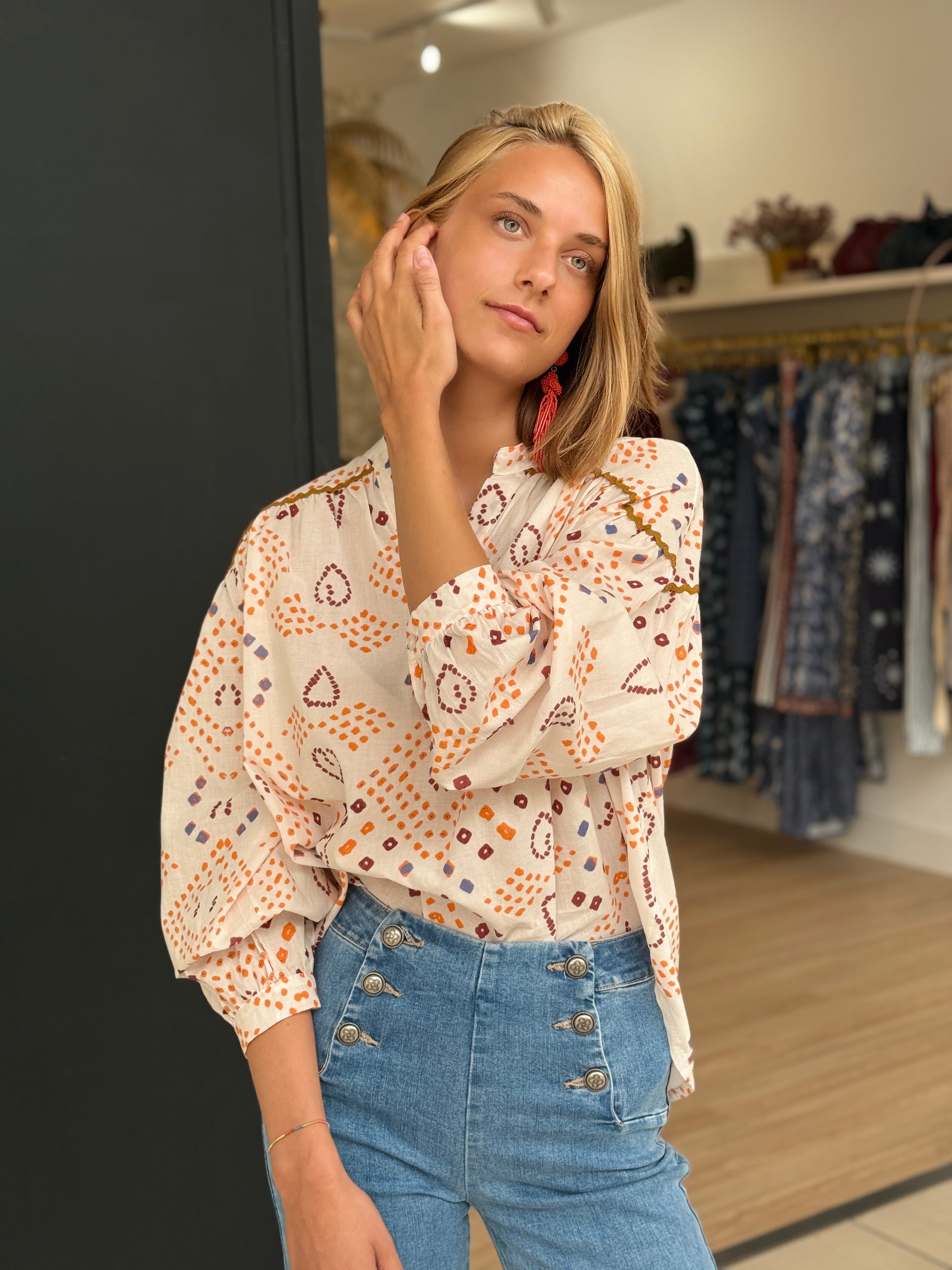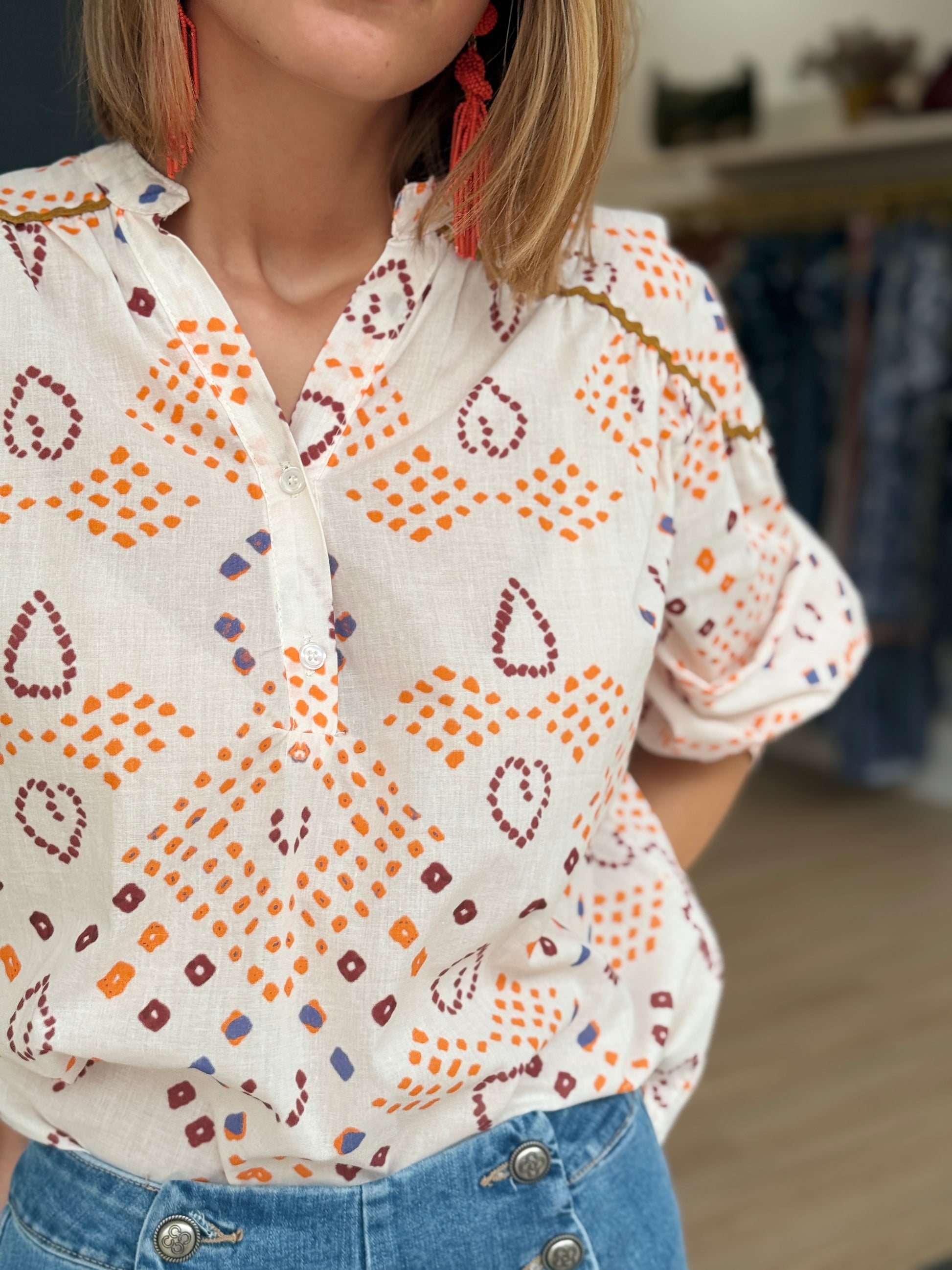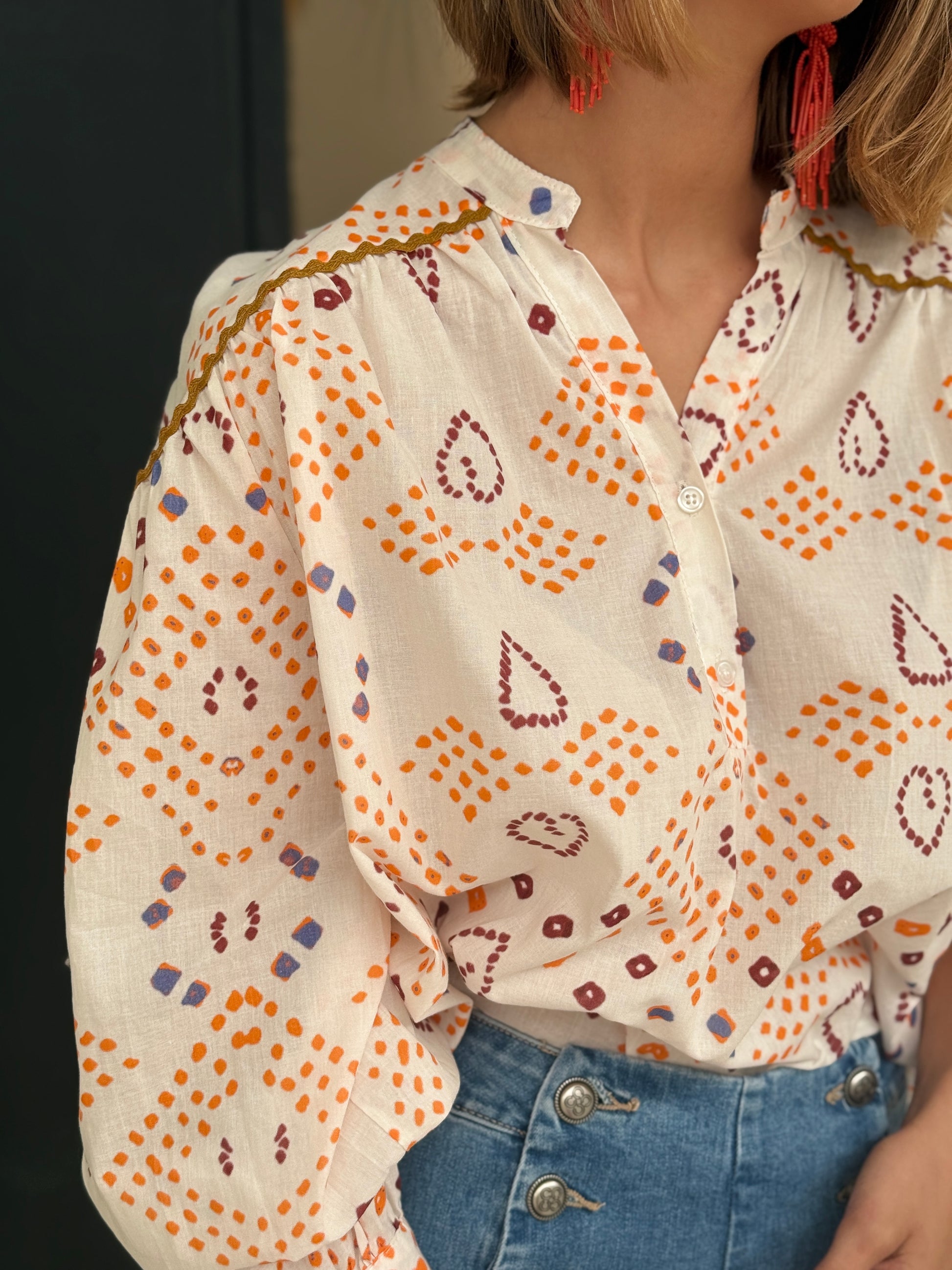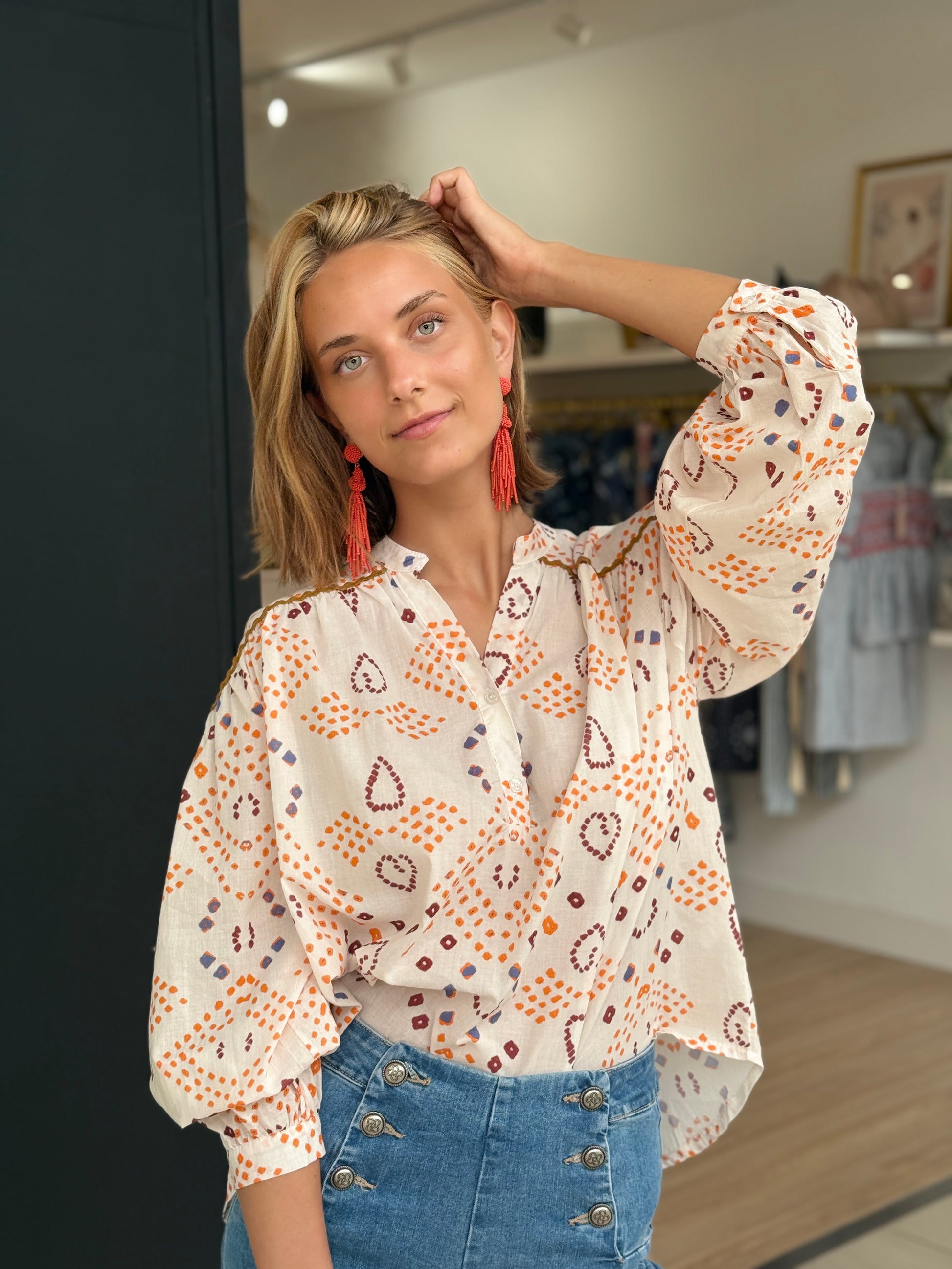 Camisa confeccionada 100% en algodón estilo oversize, con manga larga y cuello mao. Con un estampado único y muy favorecedor y detalles que no dejarán indiferente a nadie. Ideal para combinar con tus jeans preferidos. Talla única.