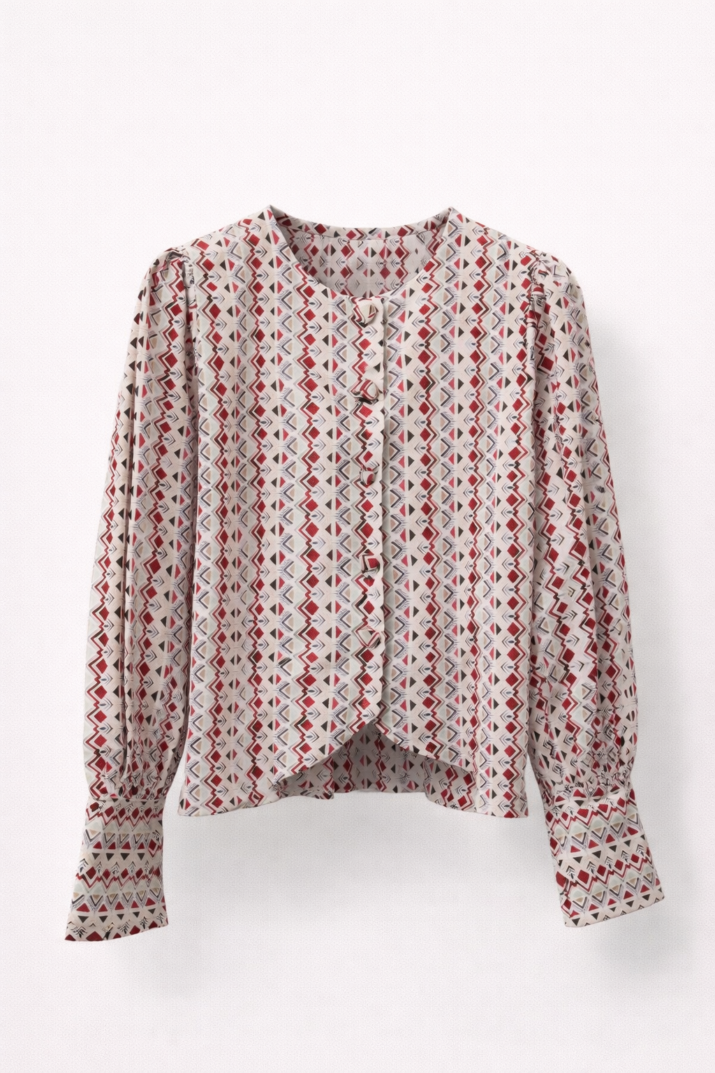 Camisa confeccionada en algodón con escote redondo, hombro abullonado y puños anchos. Con los botones forrados y la parte inferior de la camisa ligeramente más corta por la parte delantera. Ideal para combinar con el pantalón bombacho del mismo estampado. Disponible en varias tallas.