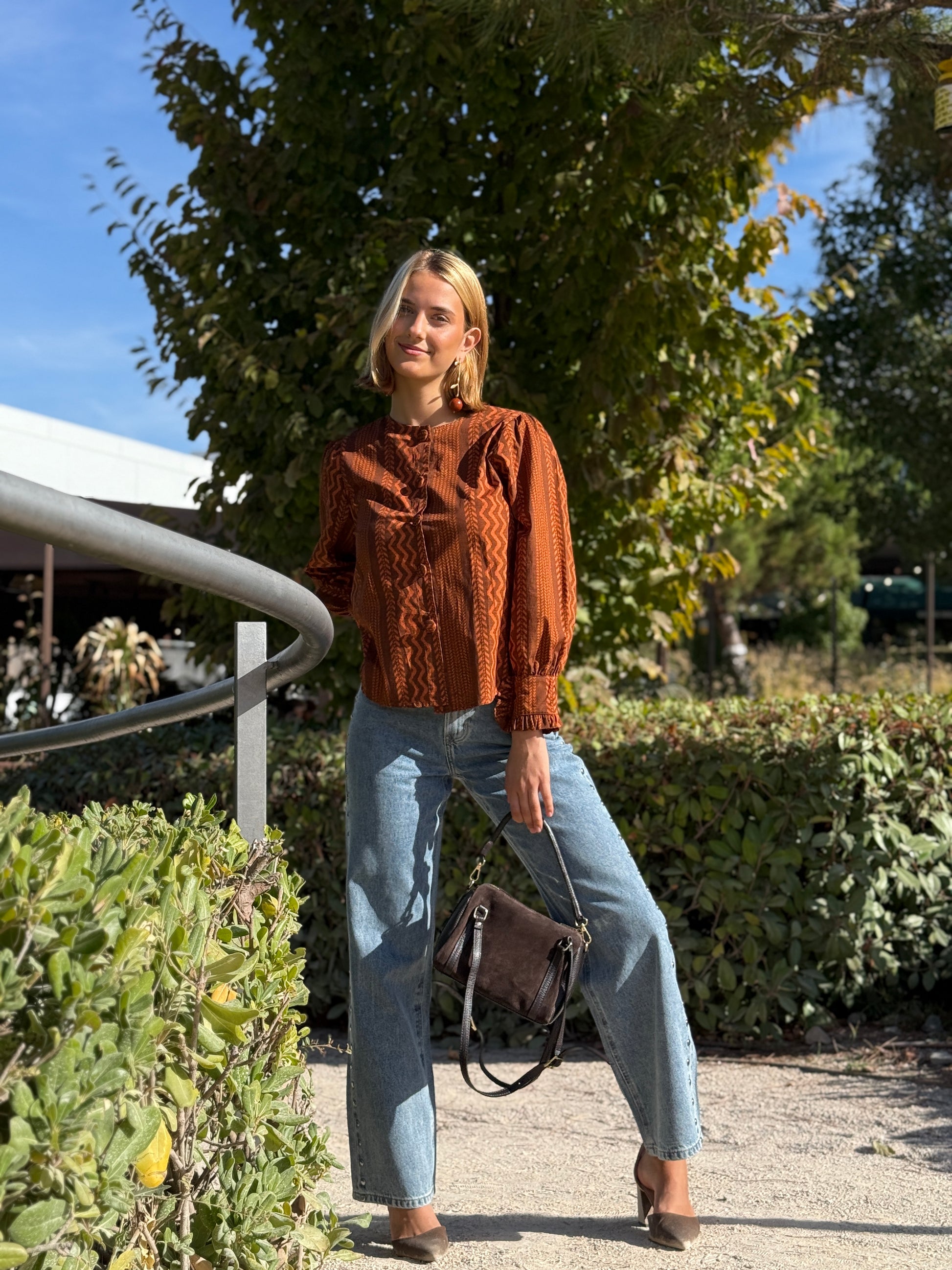 Camisa confeccionada 100% en algodón tipo popelín. De manga larga, puño con detalle de volante, cuello caja y botones forrados en la misma tela. Con un estampado de rayas muy original y un color muy favorecedor. Disponible en varias tallas.