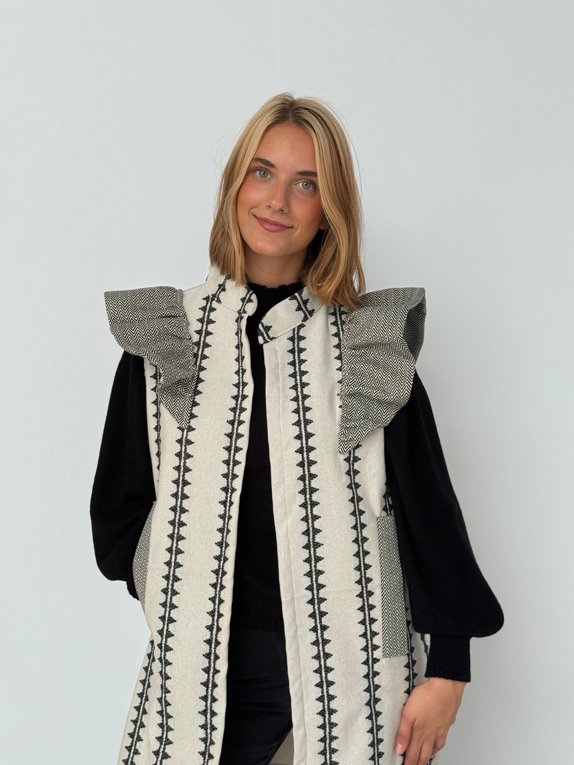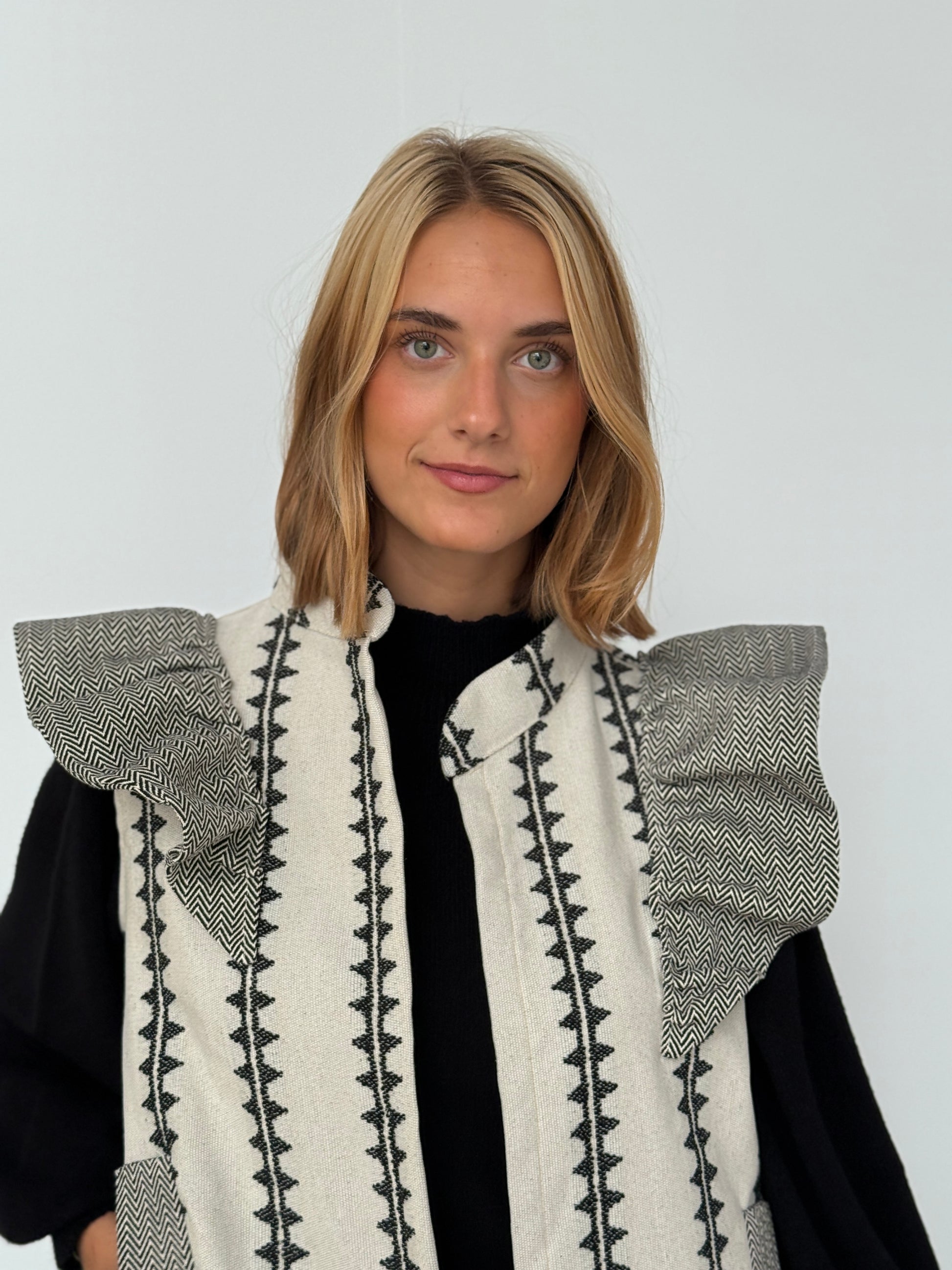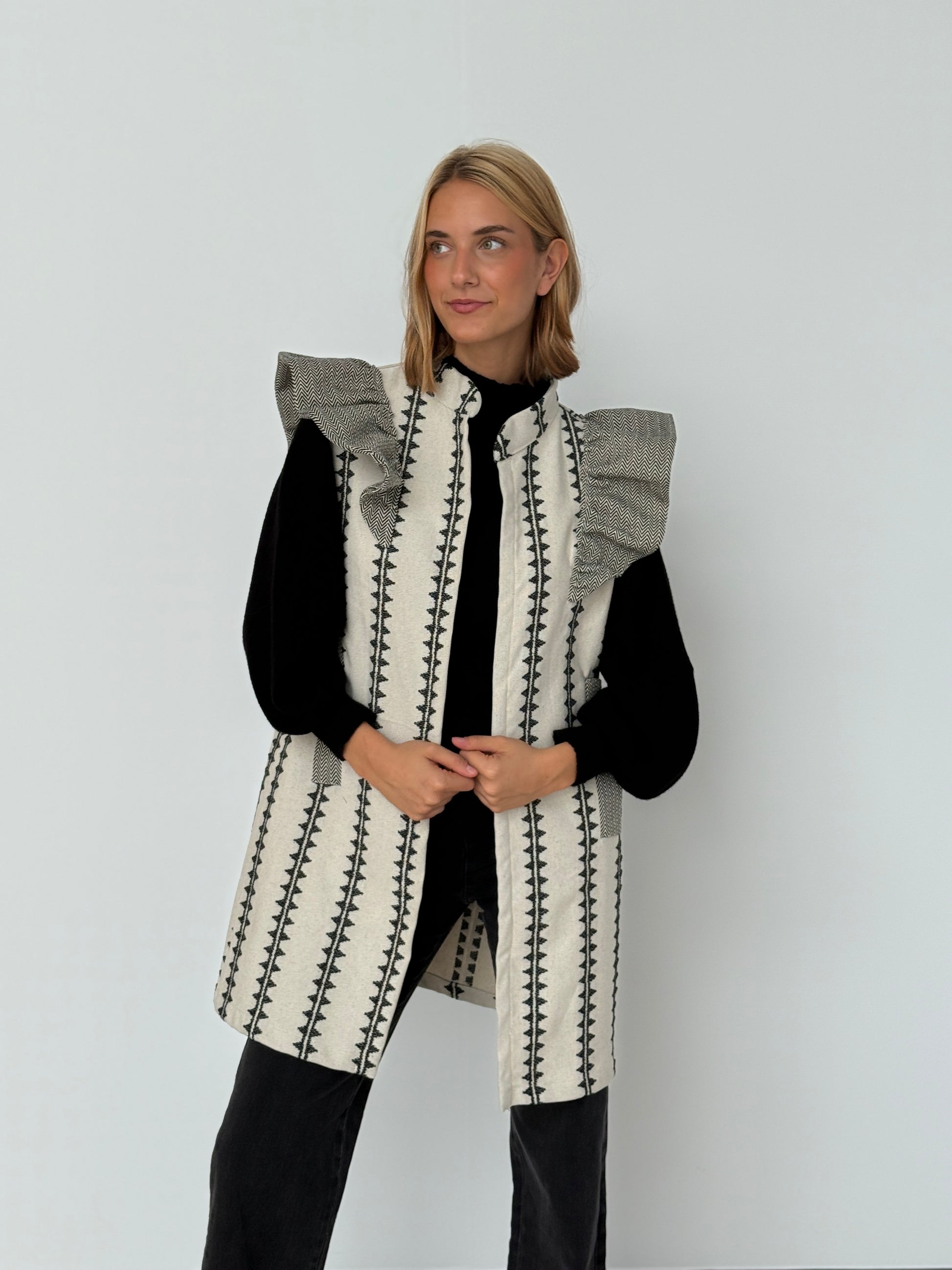 Chaleco 100% diseñado y confeccionado artesanalmente. Con una tela muy especial y un color único muy de moda, resalta por sus volantes plisados en el hombro que estilizan muchísimo. Ideal tanto para tus looks mas informales con tus jeans preferidos, como para ir arreglada a cualquier ocasión especial. Una prenda única que no dejará indiferente a nadie. Talla única.