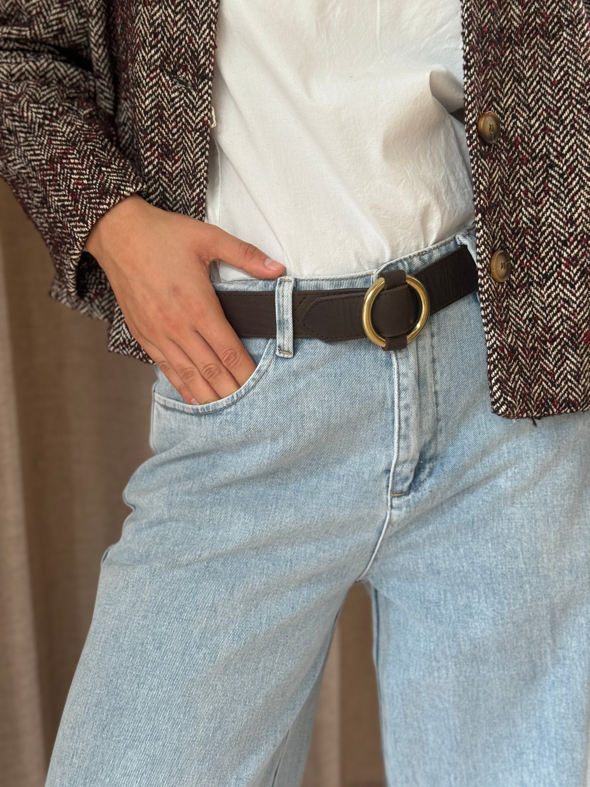 Cinturón de piel en color burdeos con hebilla en bronce desgastado en forma de aro. Sencillo y a la vez ideal para todos tus pantalones. Disponible en varias tallas.