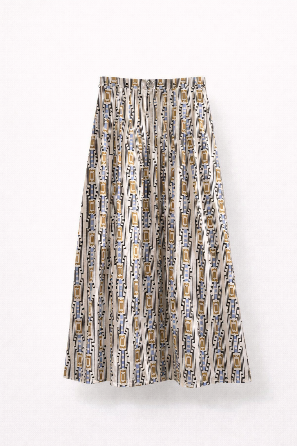 Falda estilo vaquera, de algodón con elastano. Botones y cremallera delantera y bolsillos laterales. Con apertura inferior delantera y un estampado de rayas en verde grisáceo ideal para todos tus looks delantera diario. Disponible en varias tallas.