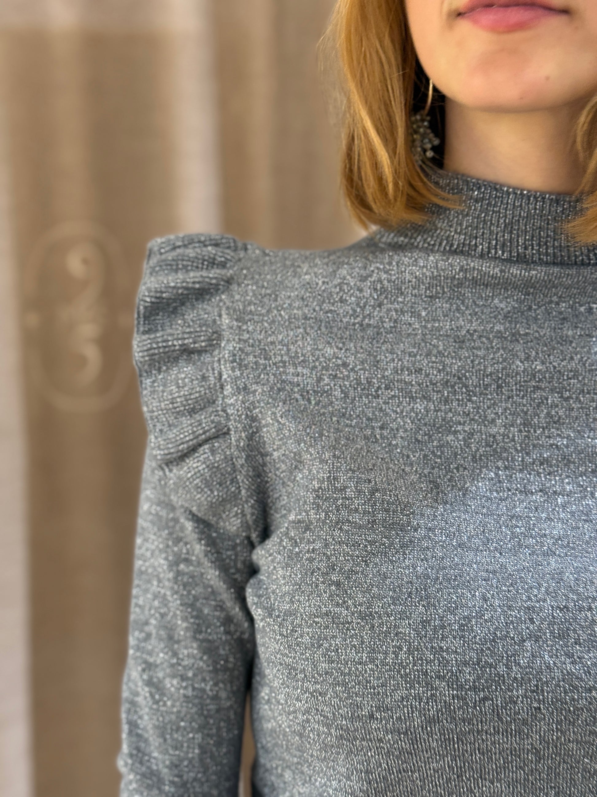 Jersey de manga larga y aplique de volantes en los hombros con el cuello perkins y ajustado al cuerpo. Un jersey ideal para levantar cualquier look. Talla única. Disponible en varios colores.