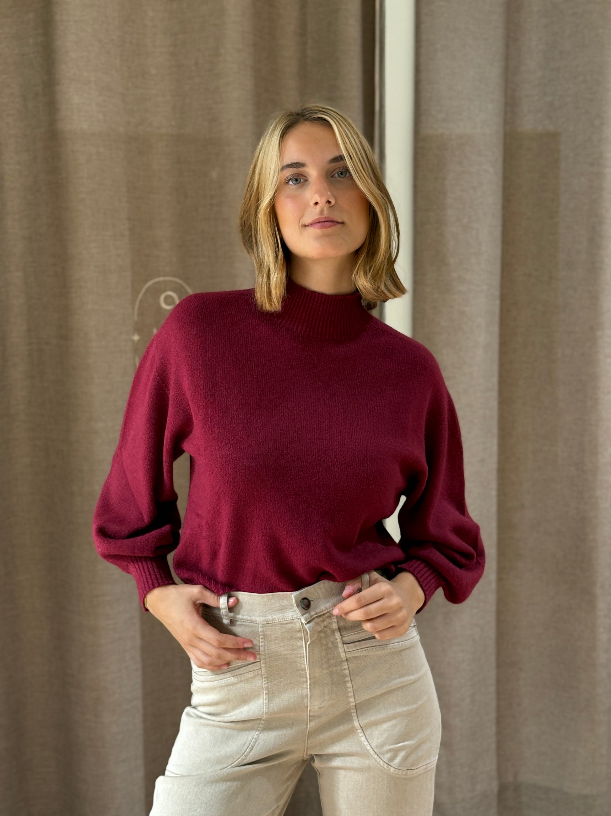 Jersey cuello perkins con manga abullonada muy favorecedora. Ideal para todos tus outfits de diario. Muy agradable al tacto. Talla única.