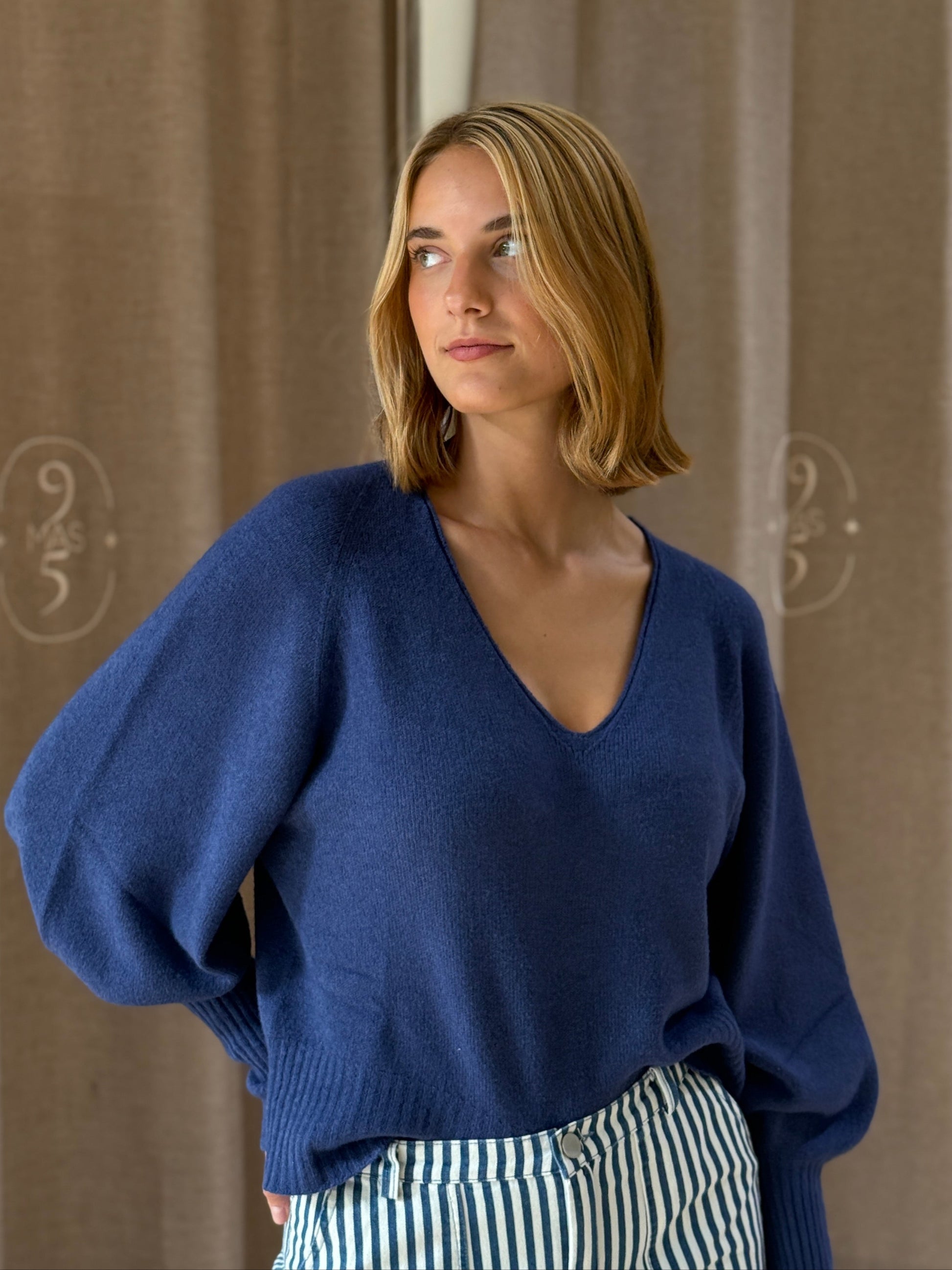 Jersey cuello pico con manga abullonada muy favorecedora. Ideal para todos tus outfits de diario y para combinar con pantalones de tiro alto y medio y faldas. Muy agradable al tacto. Talla única.