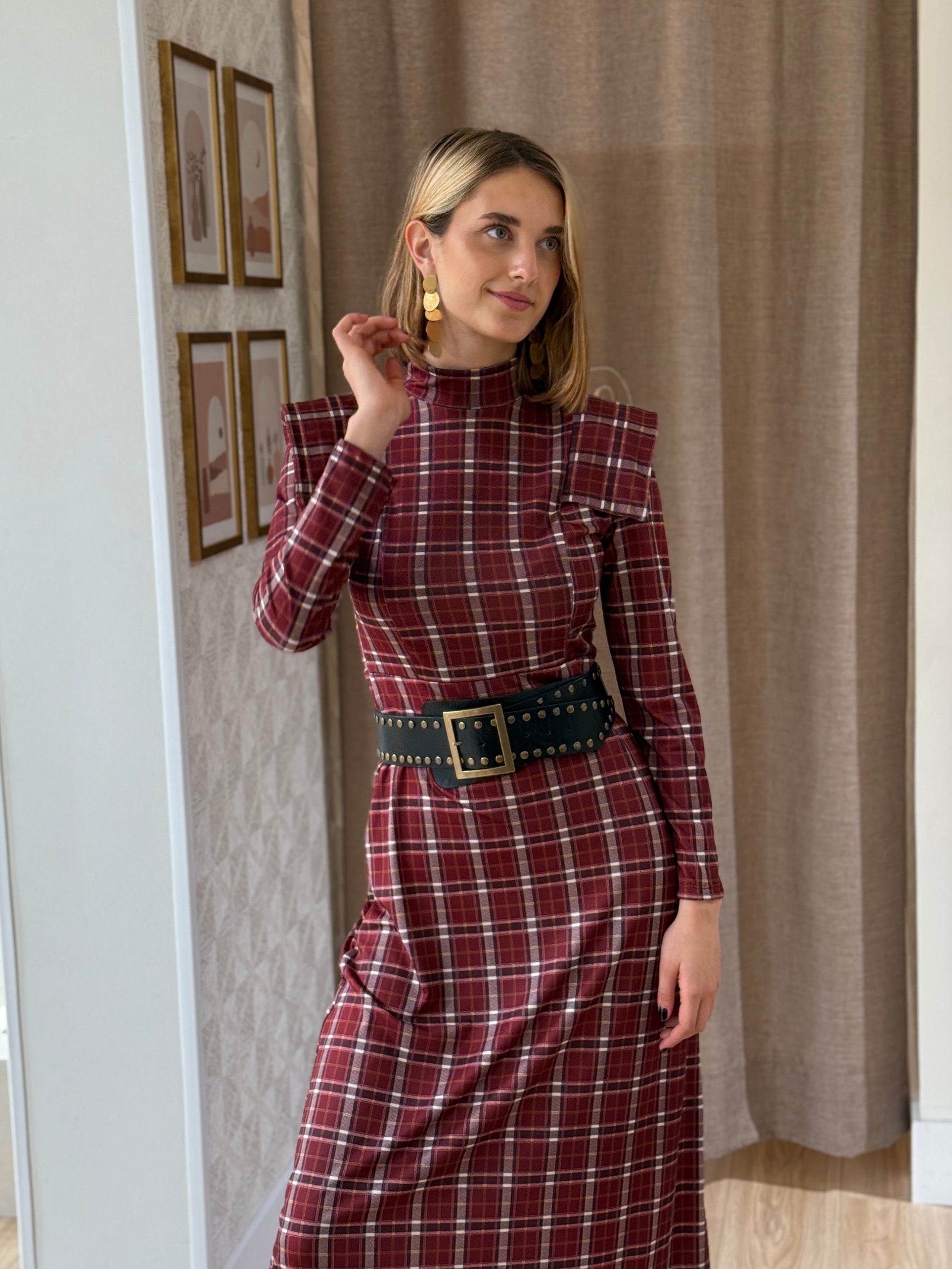Vestido Midi de seda fría y manga larga. Con aplique en el hombro que estiliza muchísimo, corte en la cintura y cuello perkins. Un vestido muy versátil y con un estampado muy de tendencia. Disponible en varias tallas.