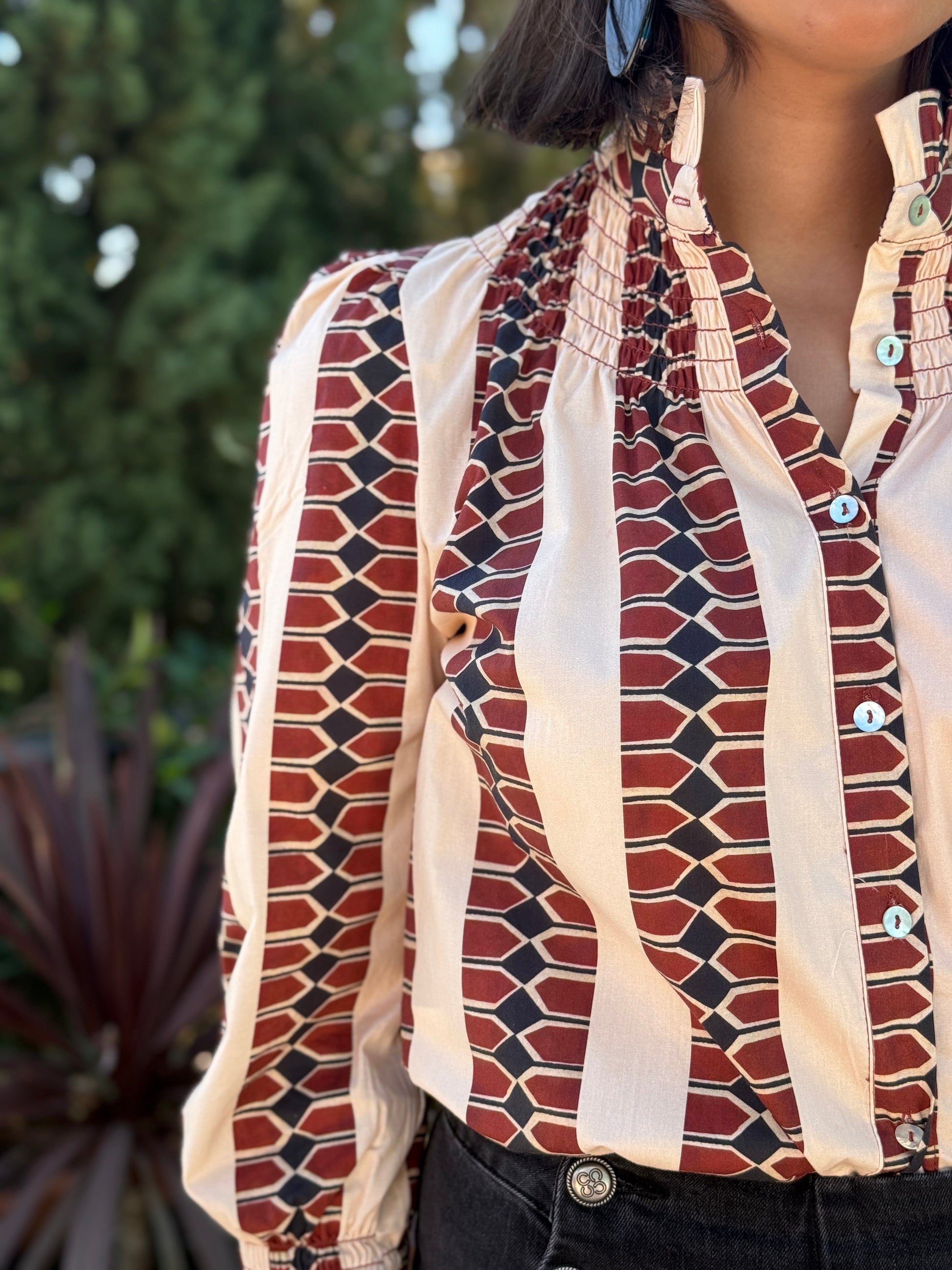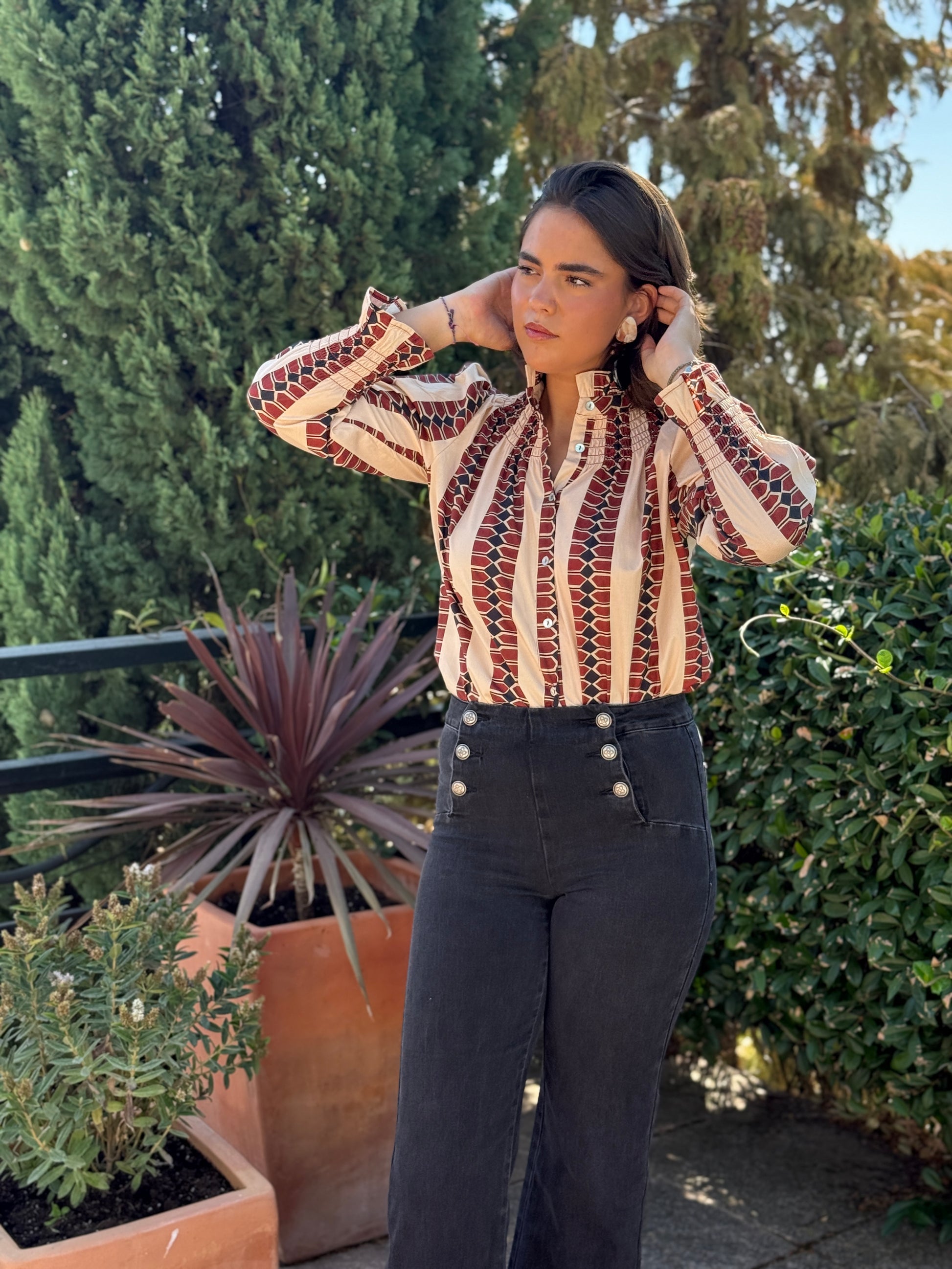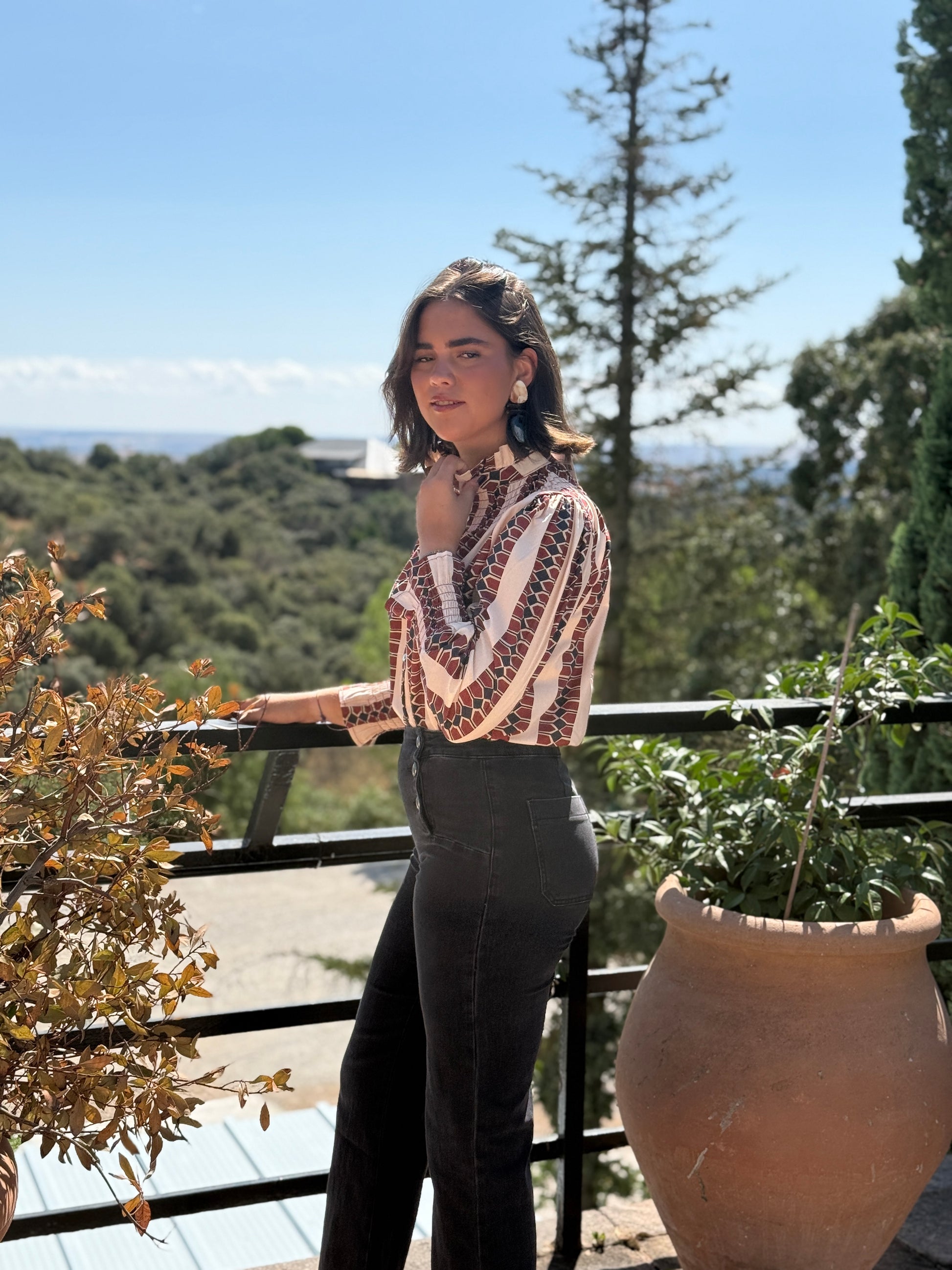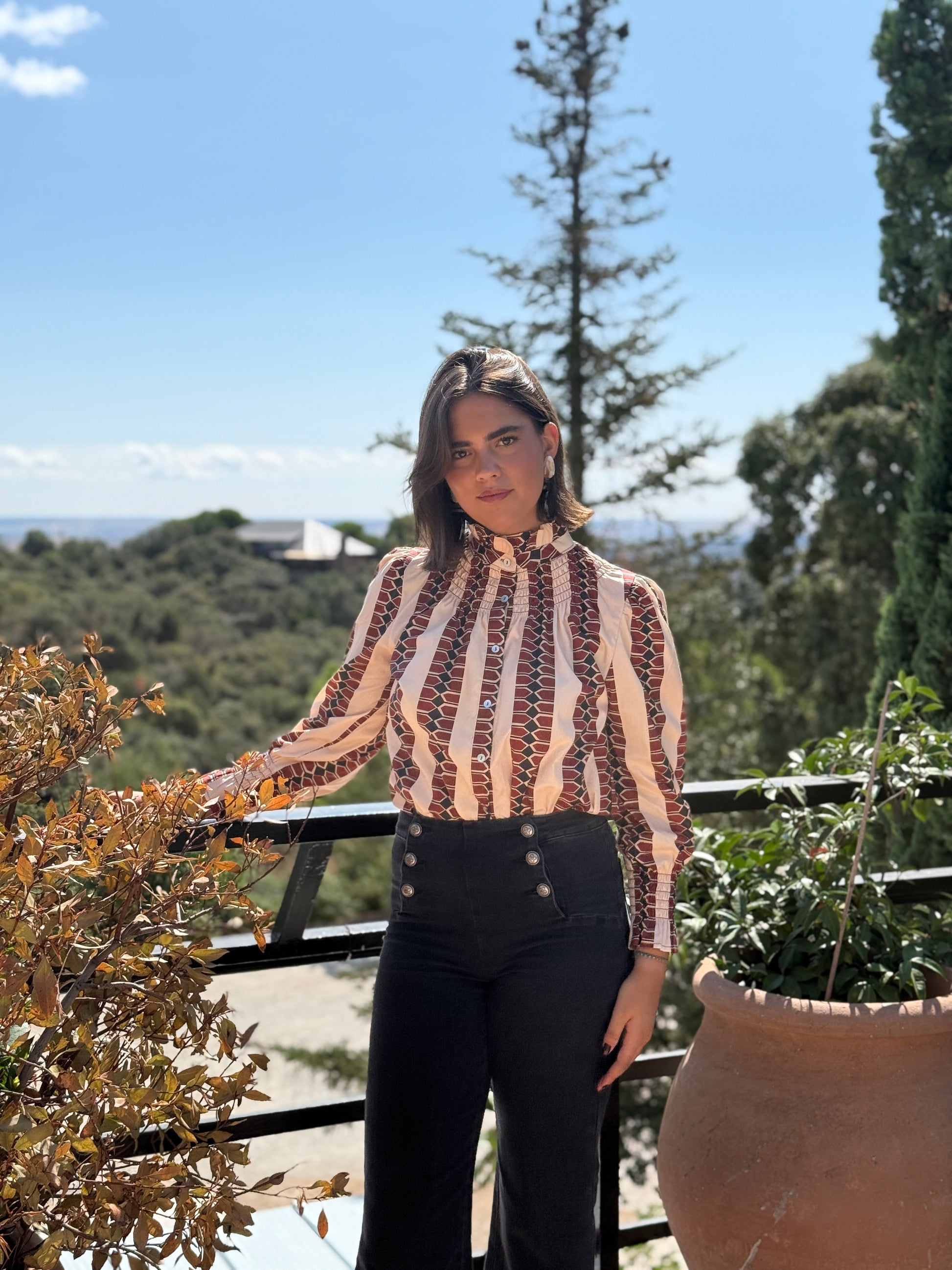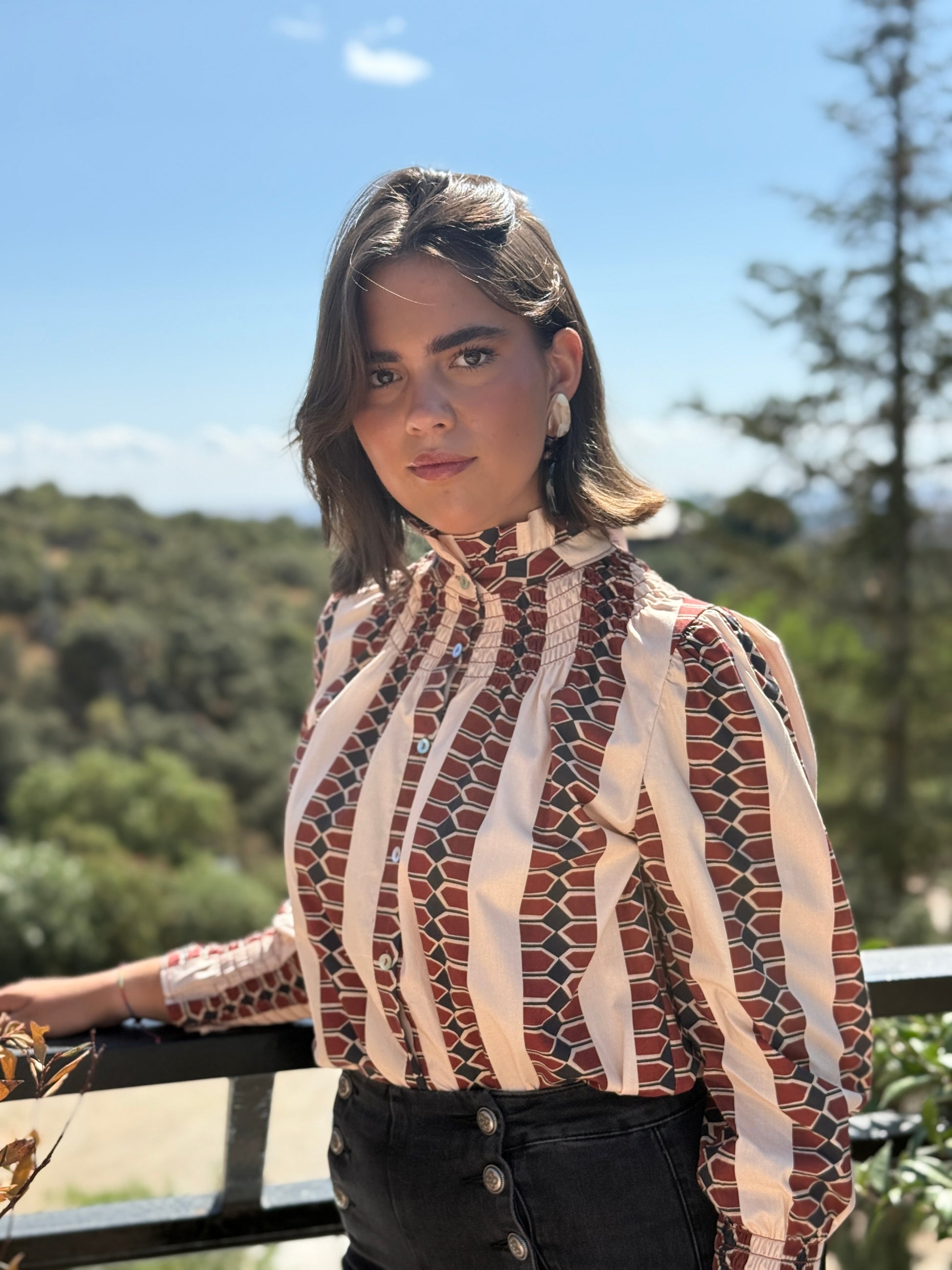 Una de las camisas más icónicas de 9MÁS5, Confeccionada 100% en algodón con elastano, Cuello alto con nido de abeja y mangas abullonadas. Ideal para todos tus looks de diario. Talla única.