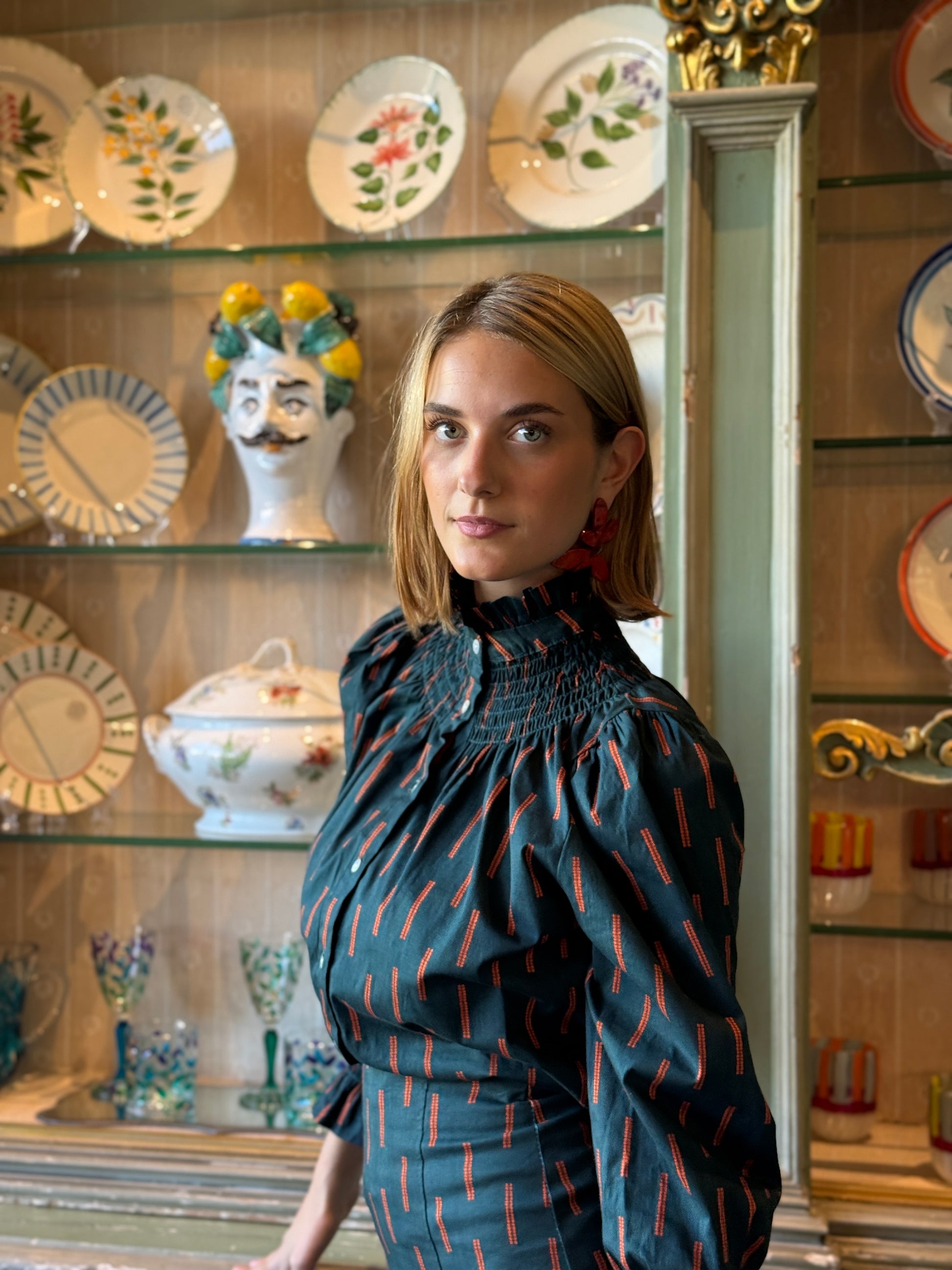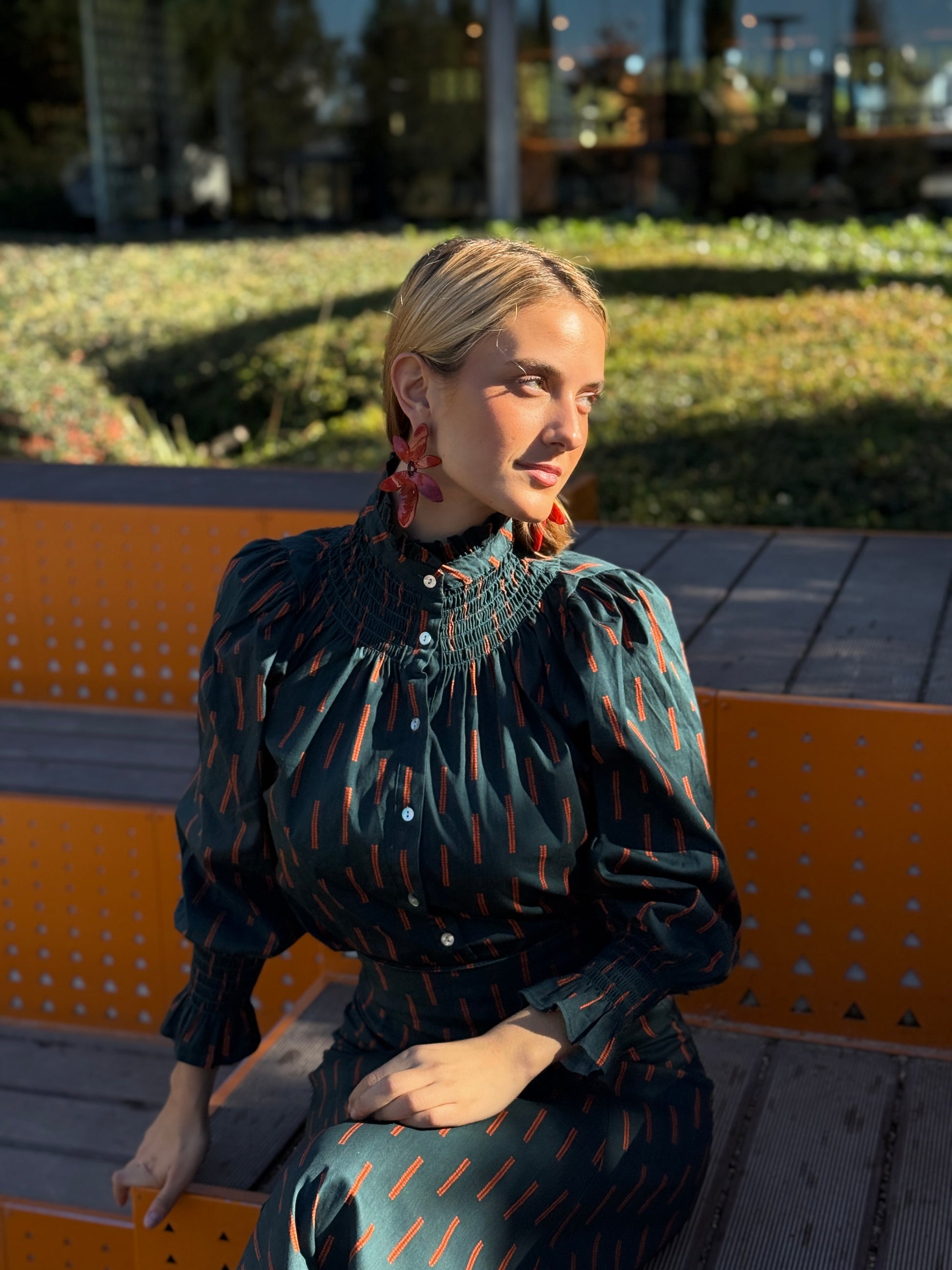 Una de las camisas más icónicas de 9MÁS5, Confeccionada 100% en algodón con elastano, Cuello alto con nido de abeja y mangas abullonadas. Ideal para todos tus looks de diario. Talla única.