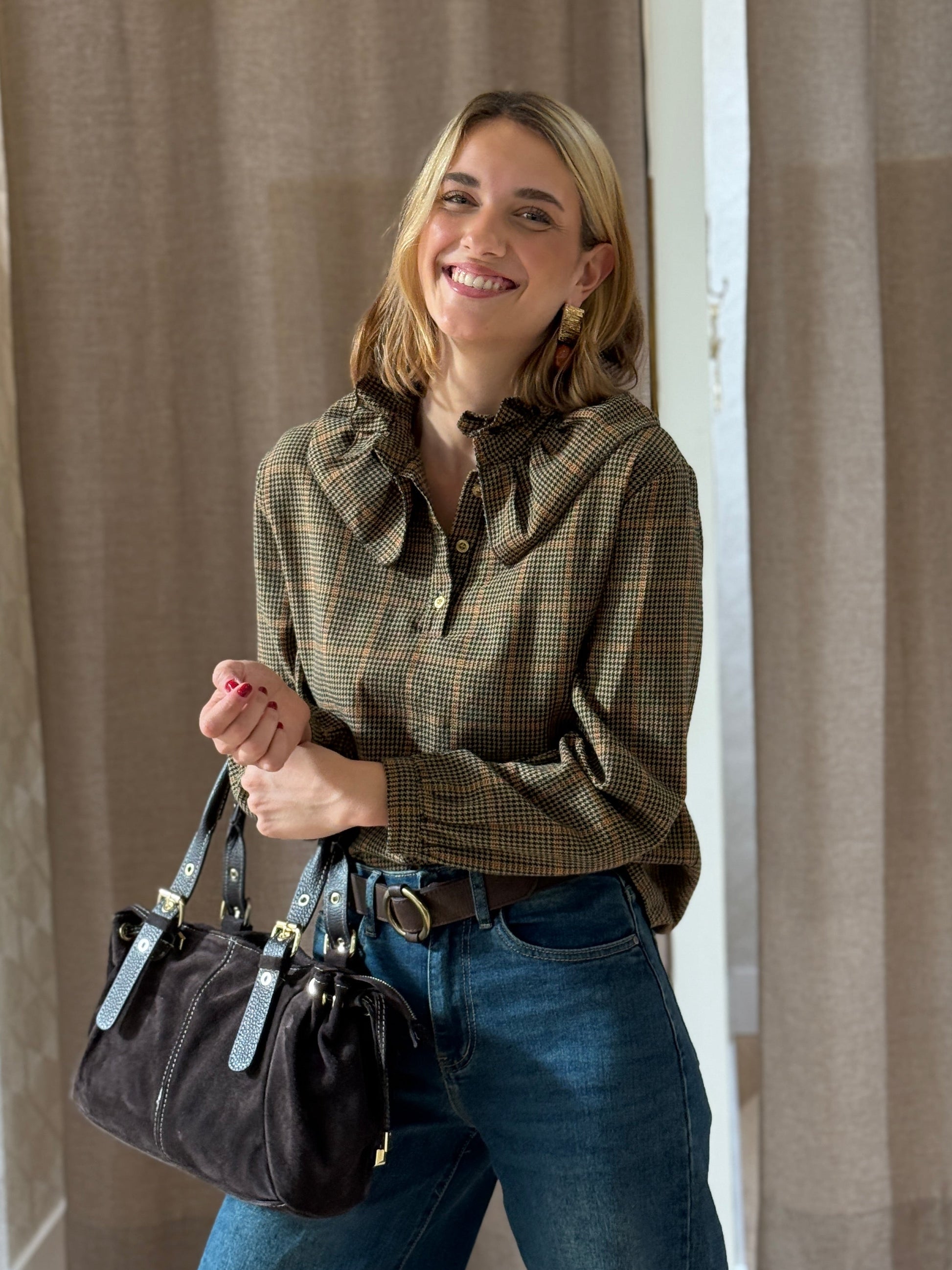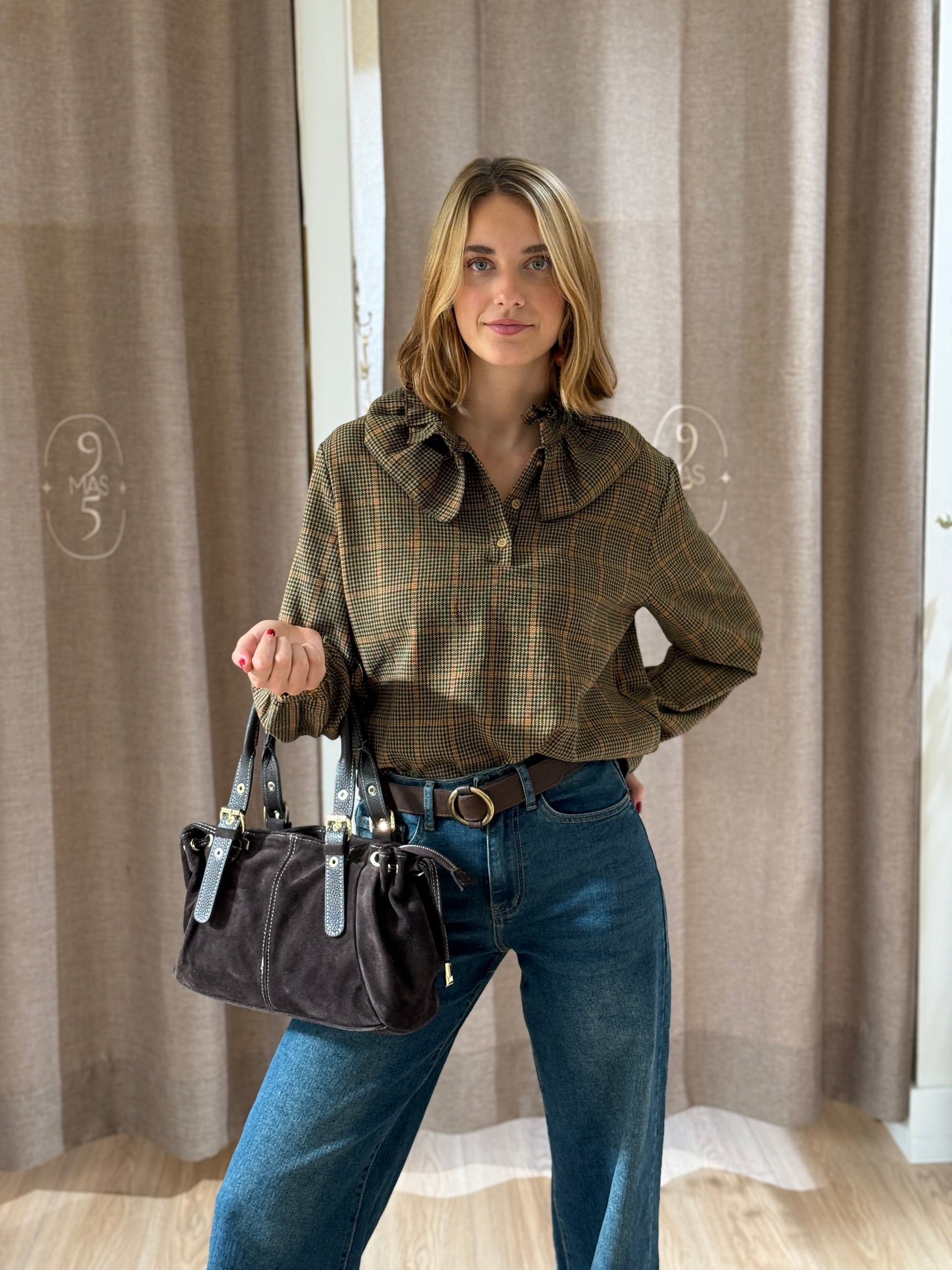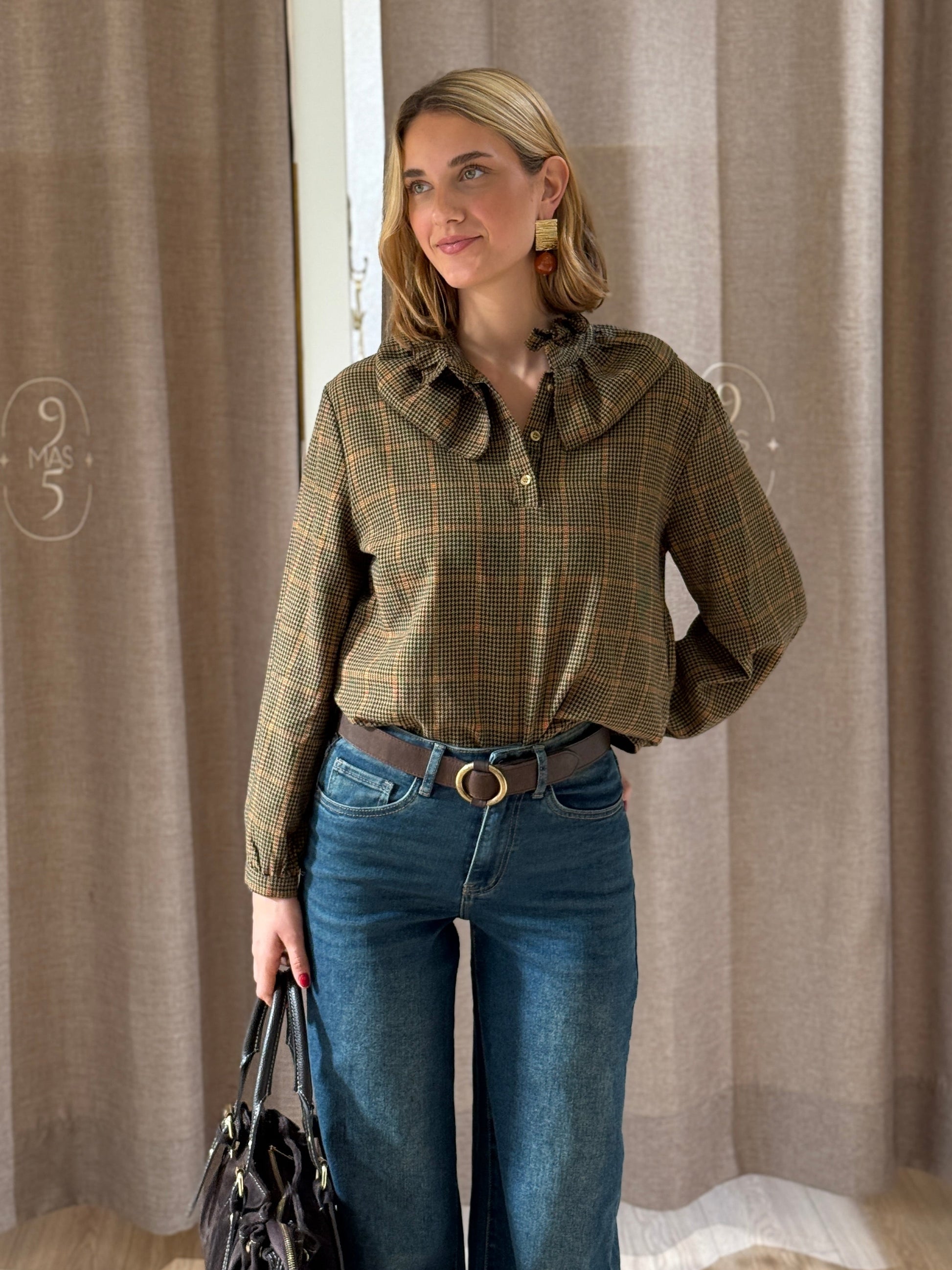 Camisa de manga larga y estampado de cuadro escocés muy en tendencia. Con botones hasta el pecho y cuello alto con volante muy favorecedor. Disponible en varias tallas.