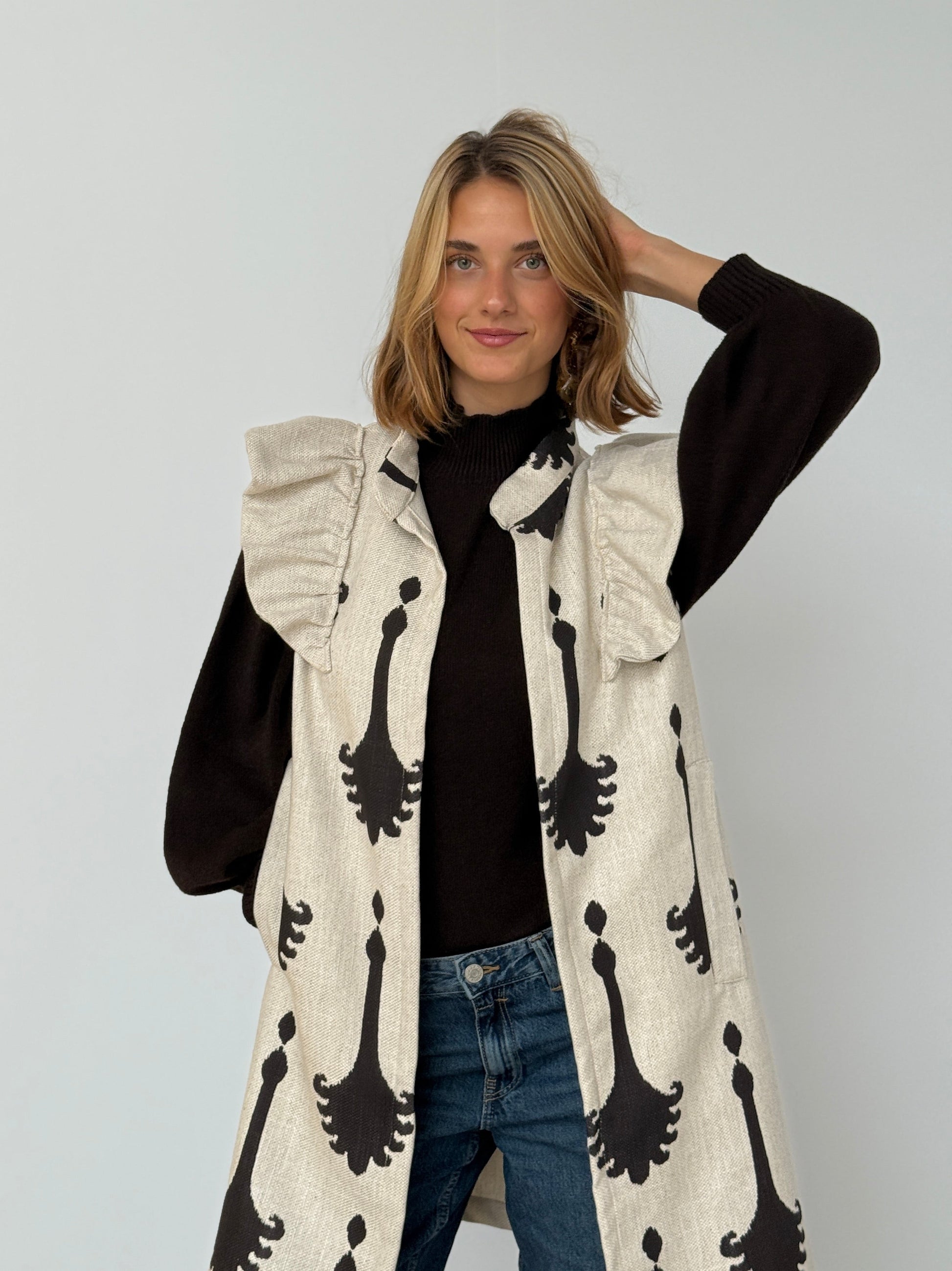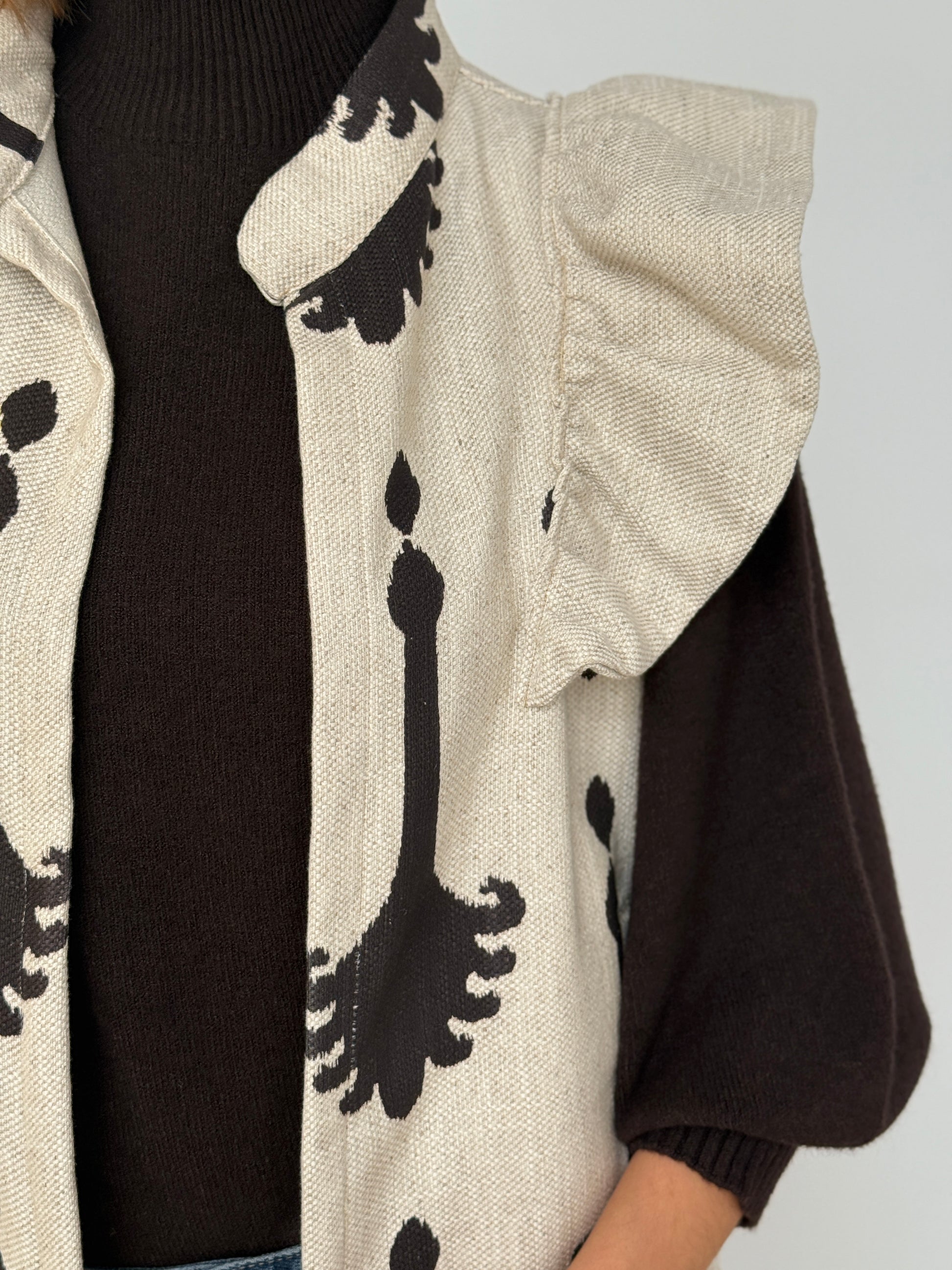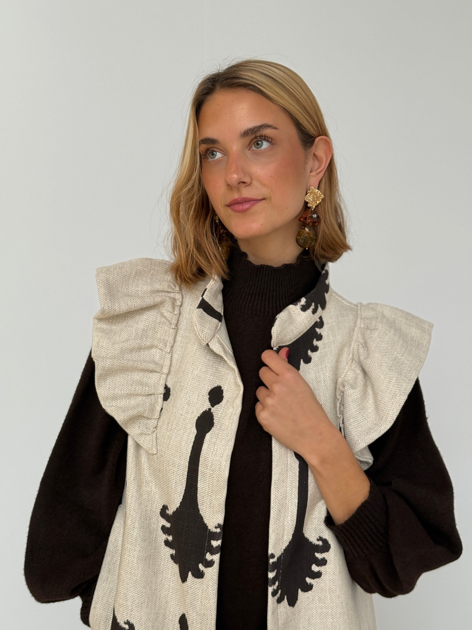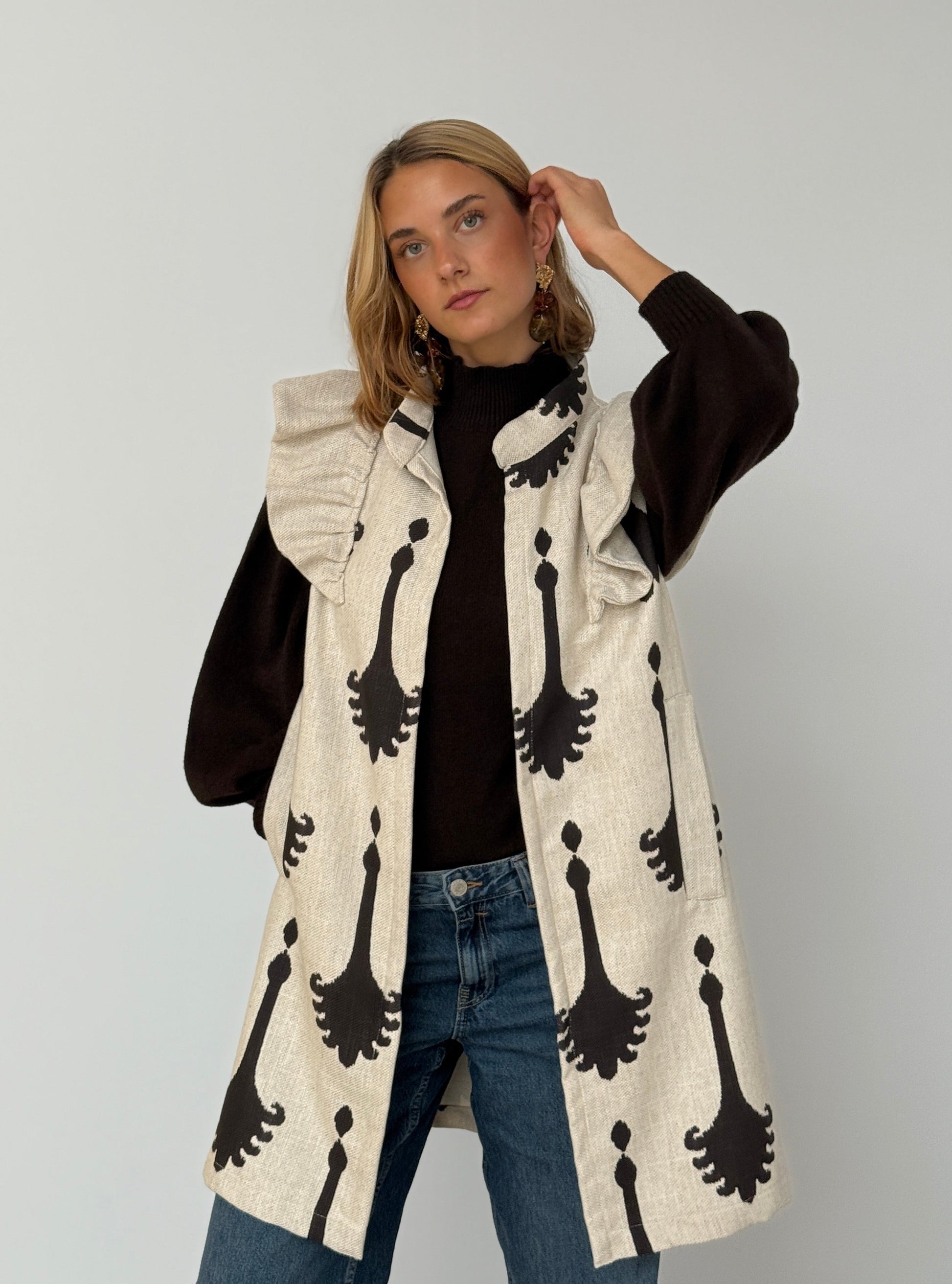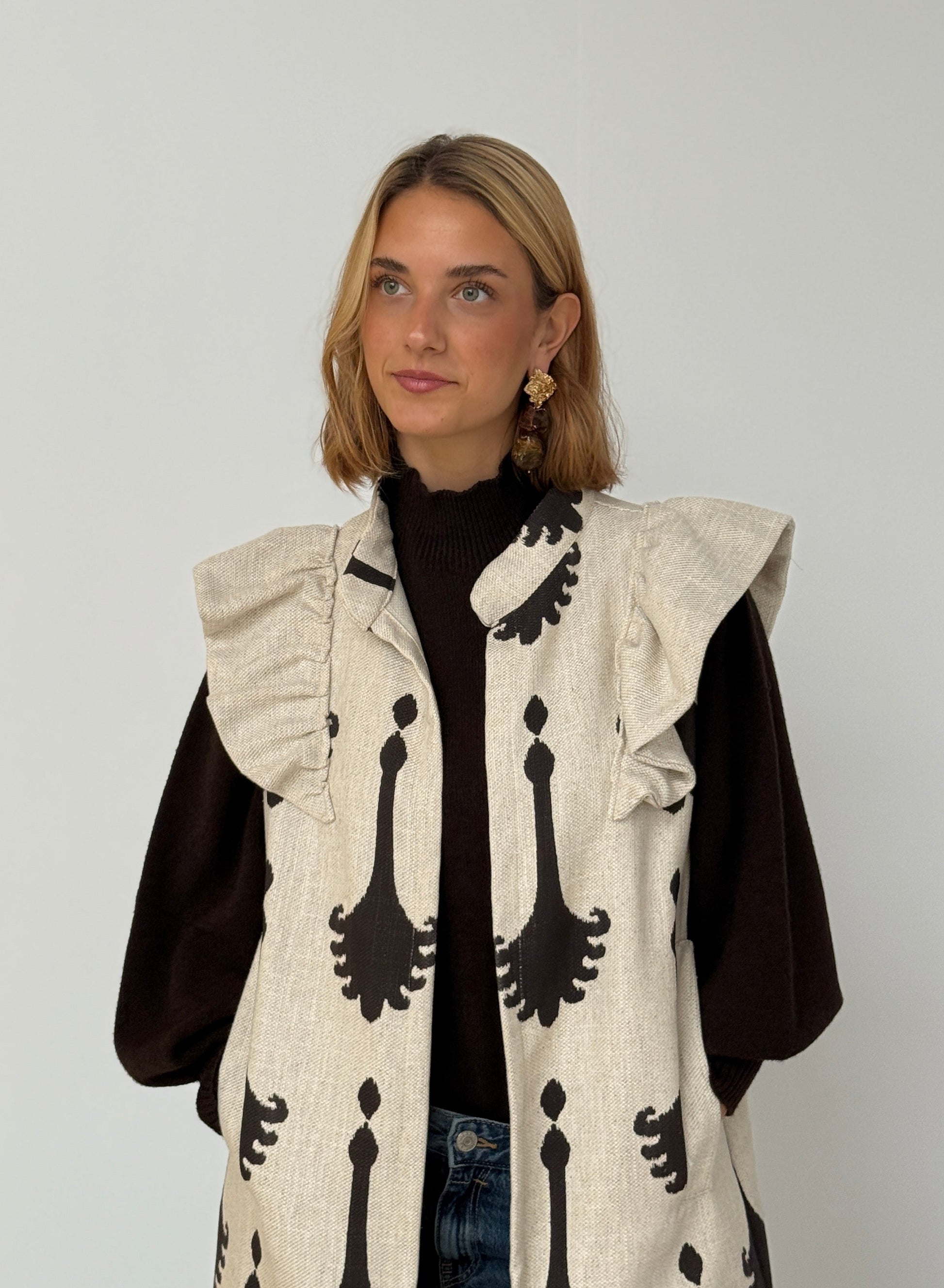 Chaleco 100% diseñado y confeccionado artesanalmente. Con una tela muy especial y un color único muy de moda, resalta por sus volantes plisados en el hombro que estilizan muchísimo. Ideal tanto para tus looks mas informales con tus jeans preferidos, como para ir arreglada a cualquier ocasión especial. Una prenda única que no dejará indiferente a nadie. Talla única.