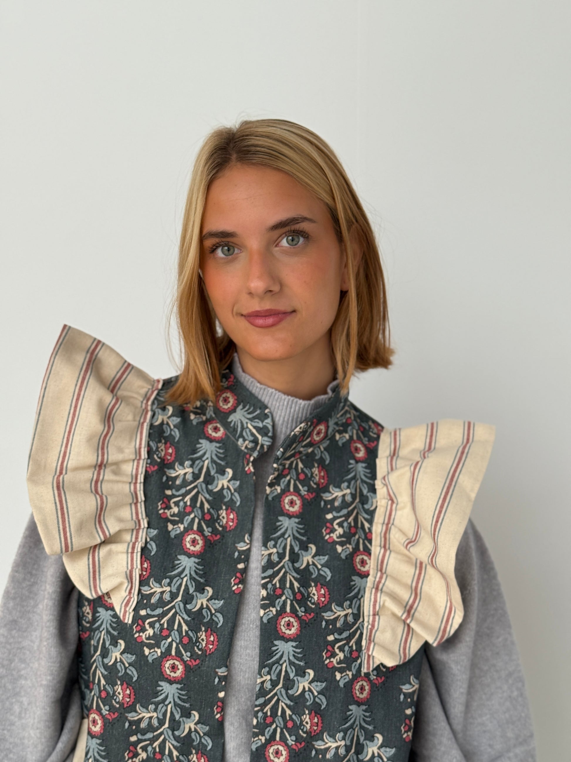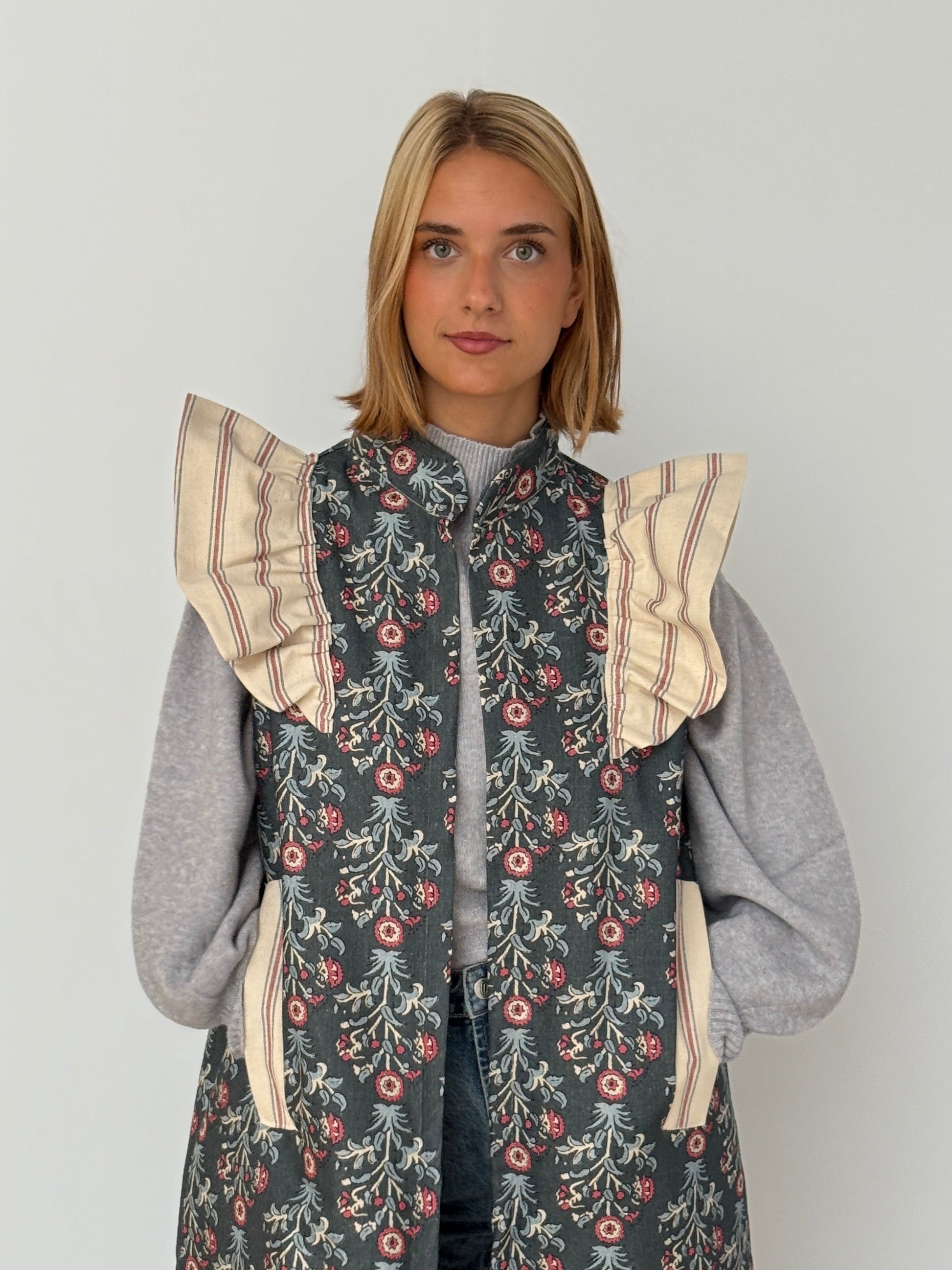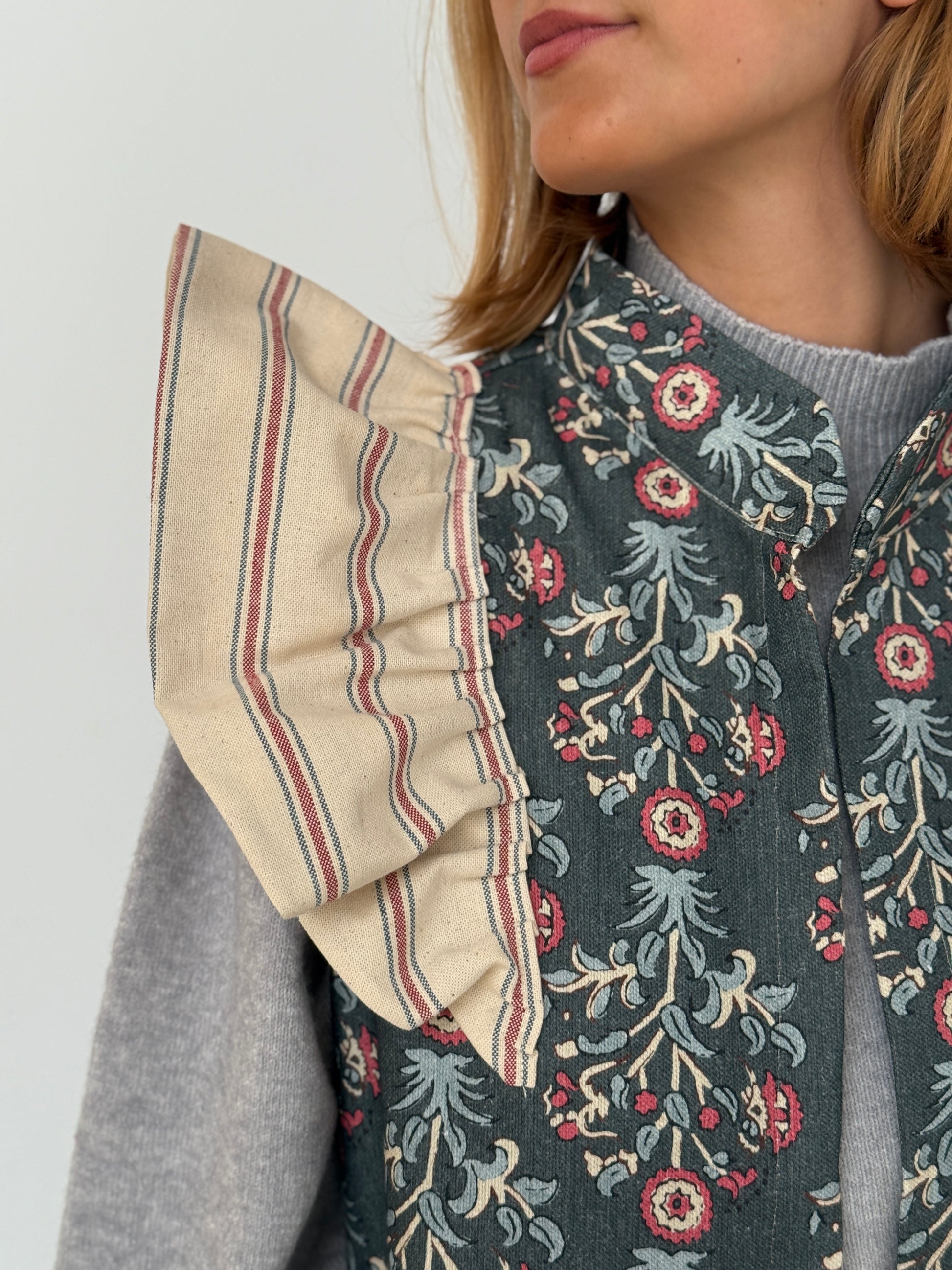 Chaleco 100% diseñado y confeccionado artesanalmente. Con una tela muy especial y un color único muy de moda, resalta por sus volantes plisados en el hombro que estilizan muchísimo. Ideal tanto para tus looks mas informales con tus jeans preferidos, como para ir arreglada a cualquier ocasión especial. Una prenda única que no dejará indiferente a nadie. Talla única.