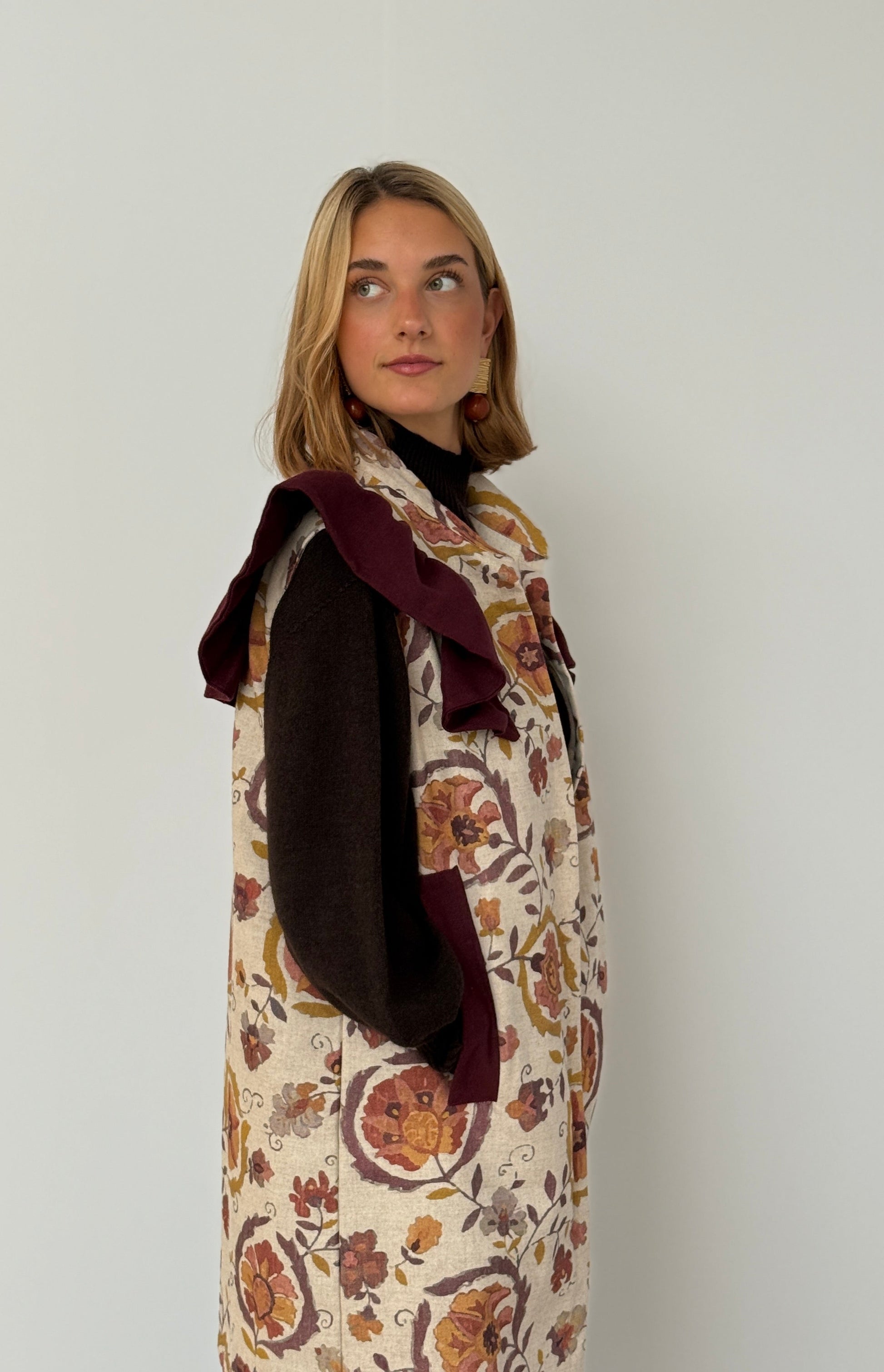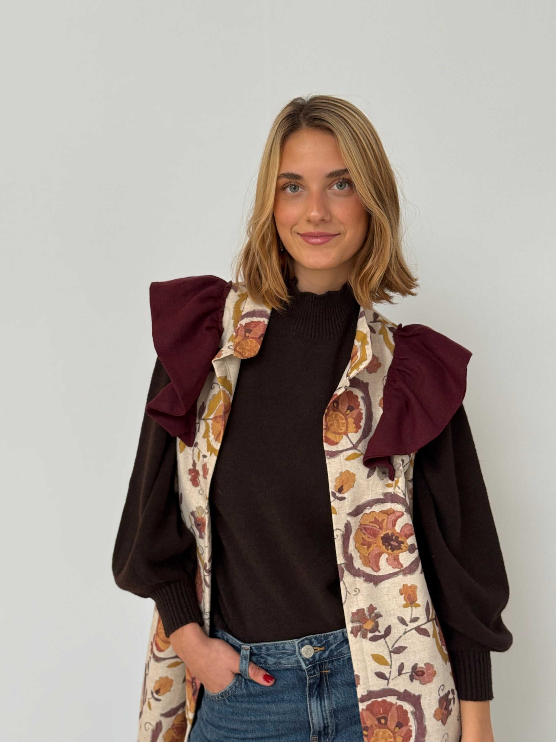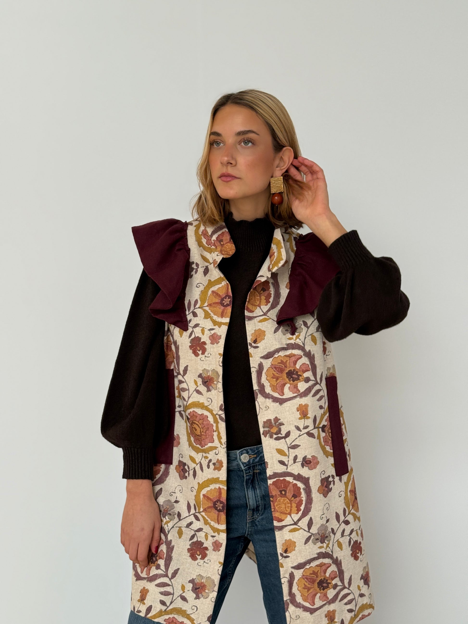 Chaleco 9MÁS5 Flores Burdeos y Mostaza