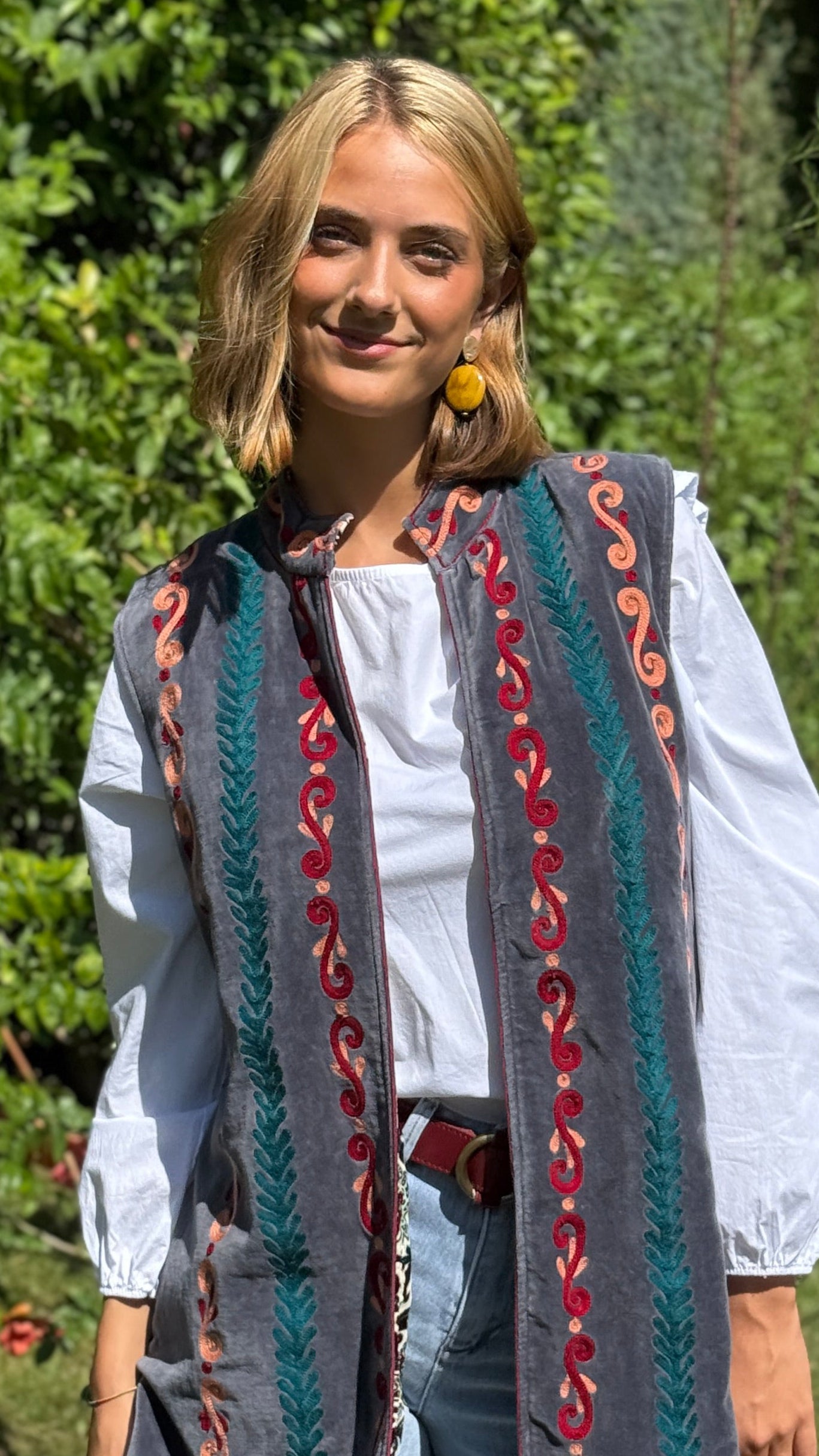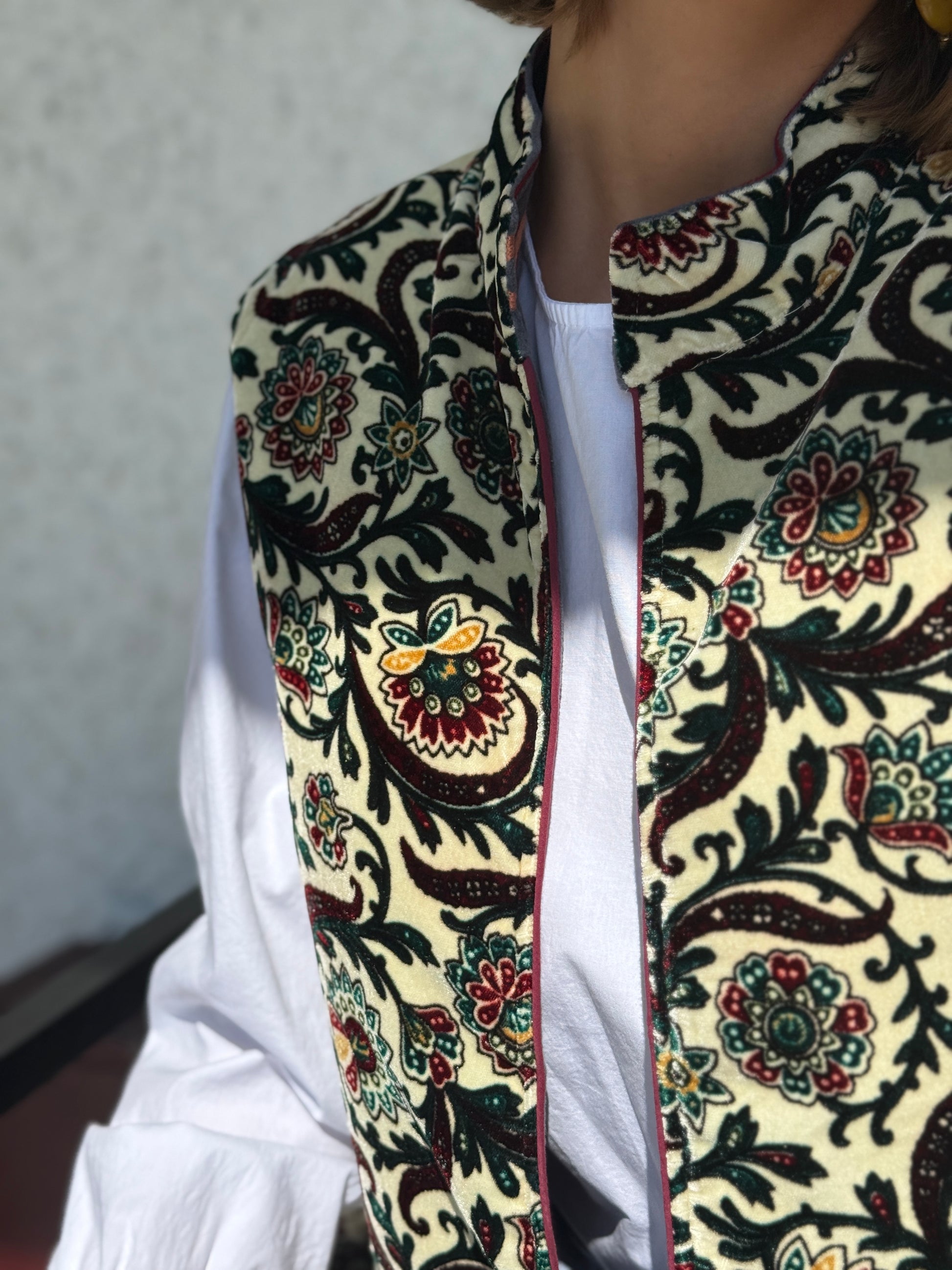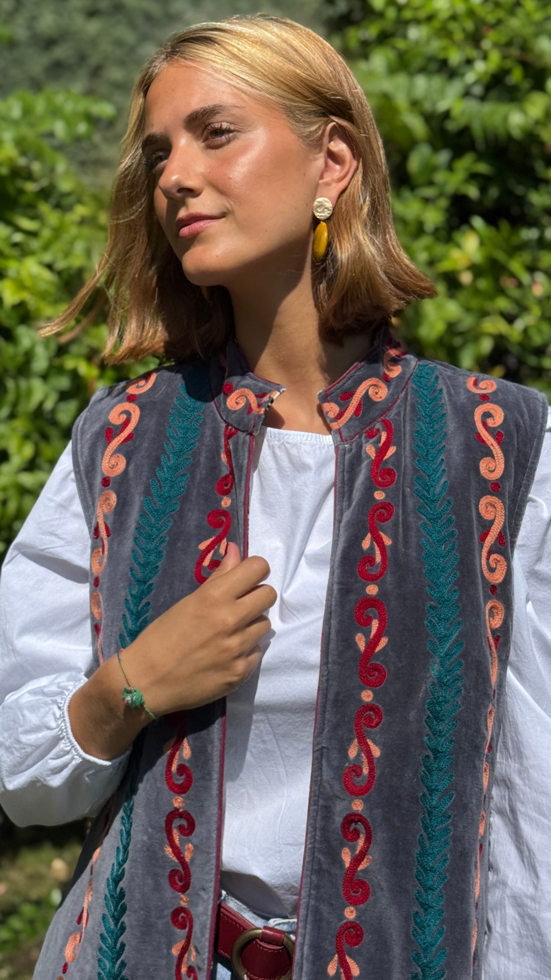 Chaleco 100% diseñado y confeccionado artesanalmente. Con una tela muy especial y un color único muy de moda, resalta por su bordado hecho a mano con colores de tendencia y por ser reversible. En la parte interior podrás encontrar un terciopelo bordado ideal para combinar con cualquier look. Ideal tanto para tus outfits mas informales con tus jeans preferidos, como para ir arreglada a cualquier ocasión especial. Una prenda única que no dejará indiferente a nadie. Disponible en varias tallas. La modelo viste la talla M.