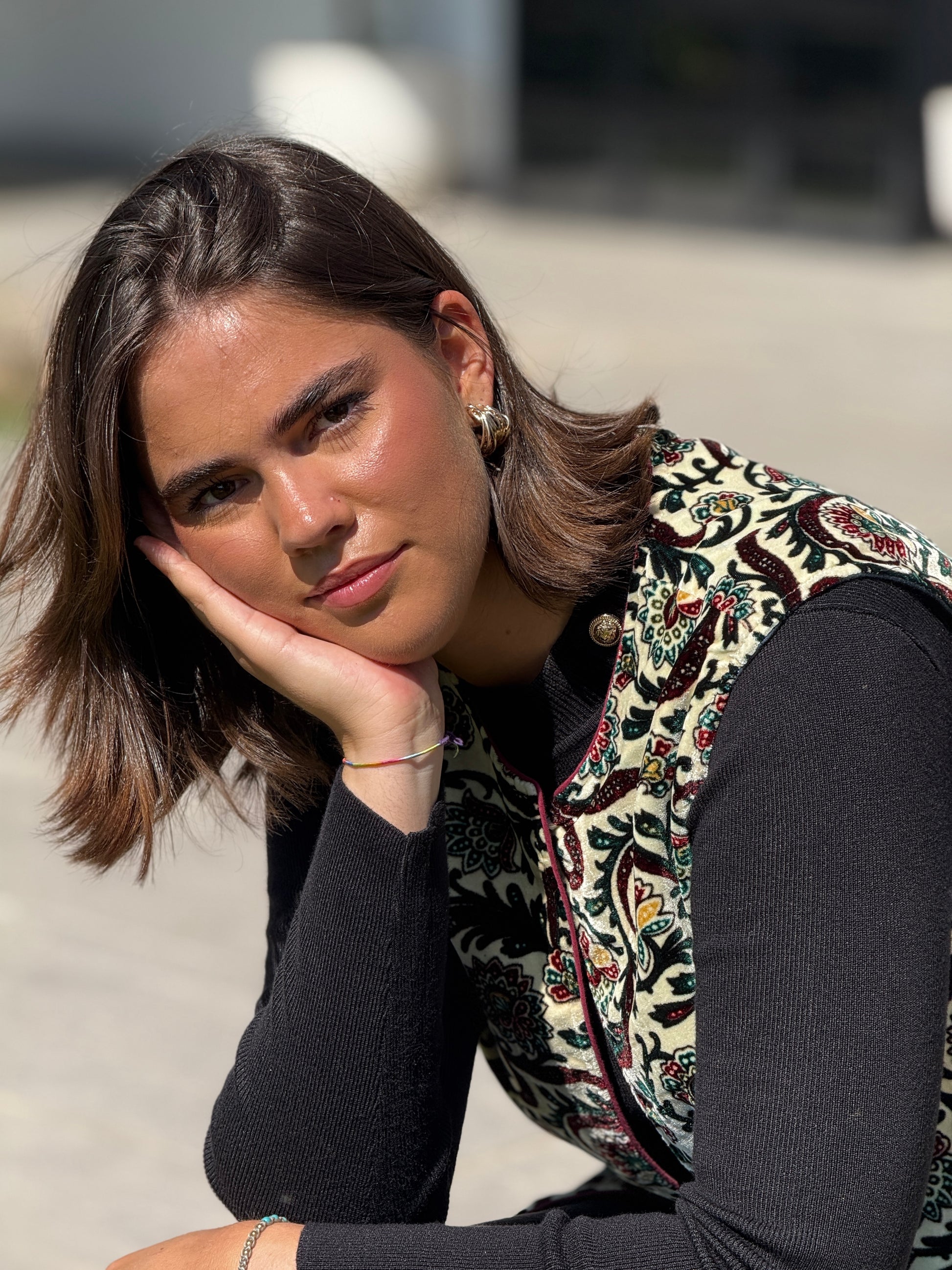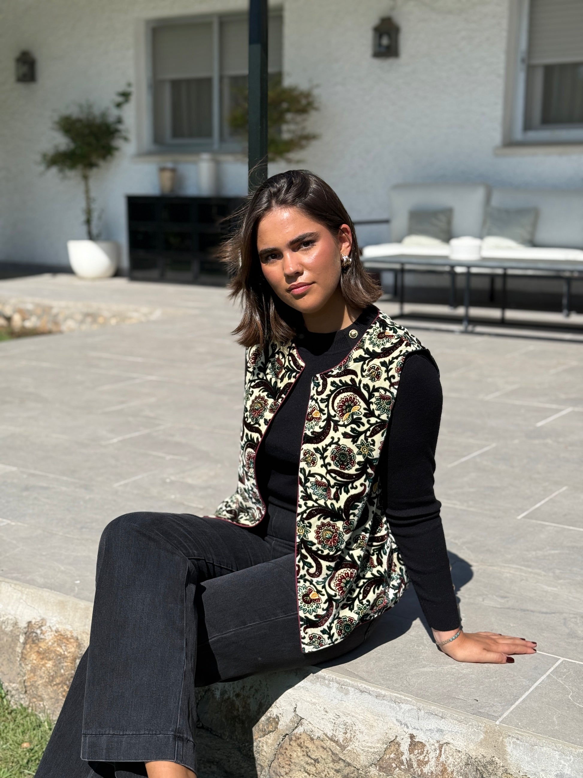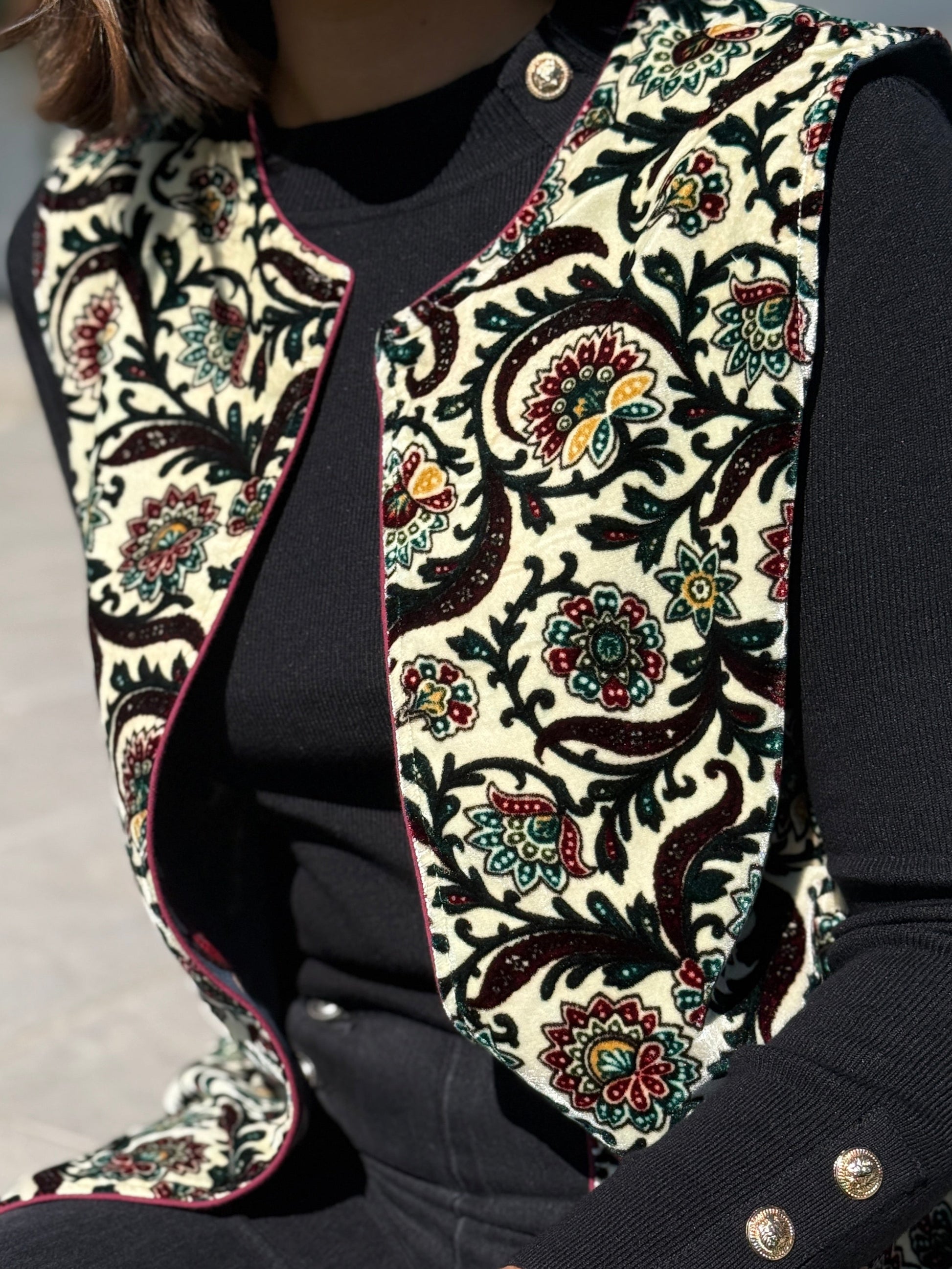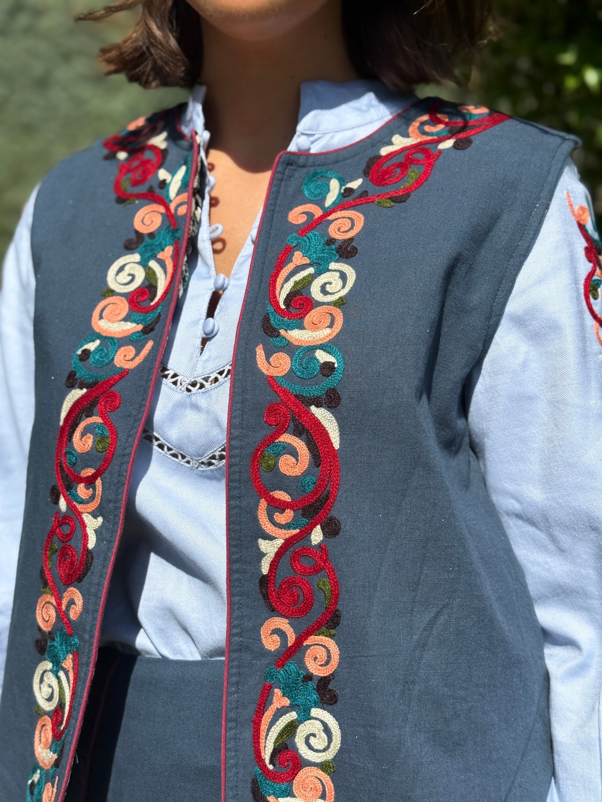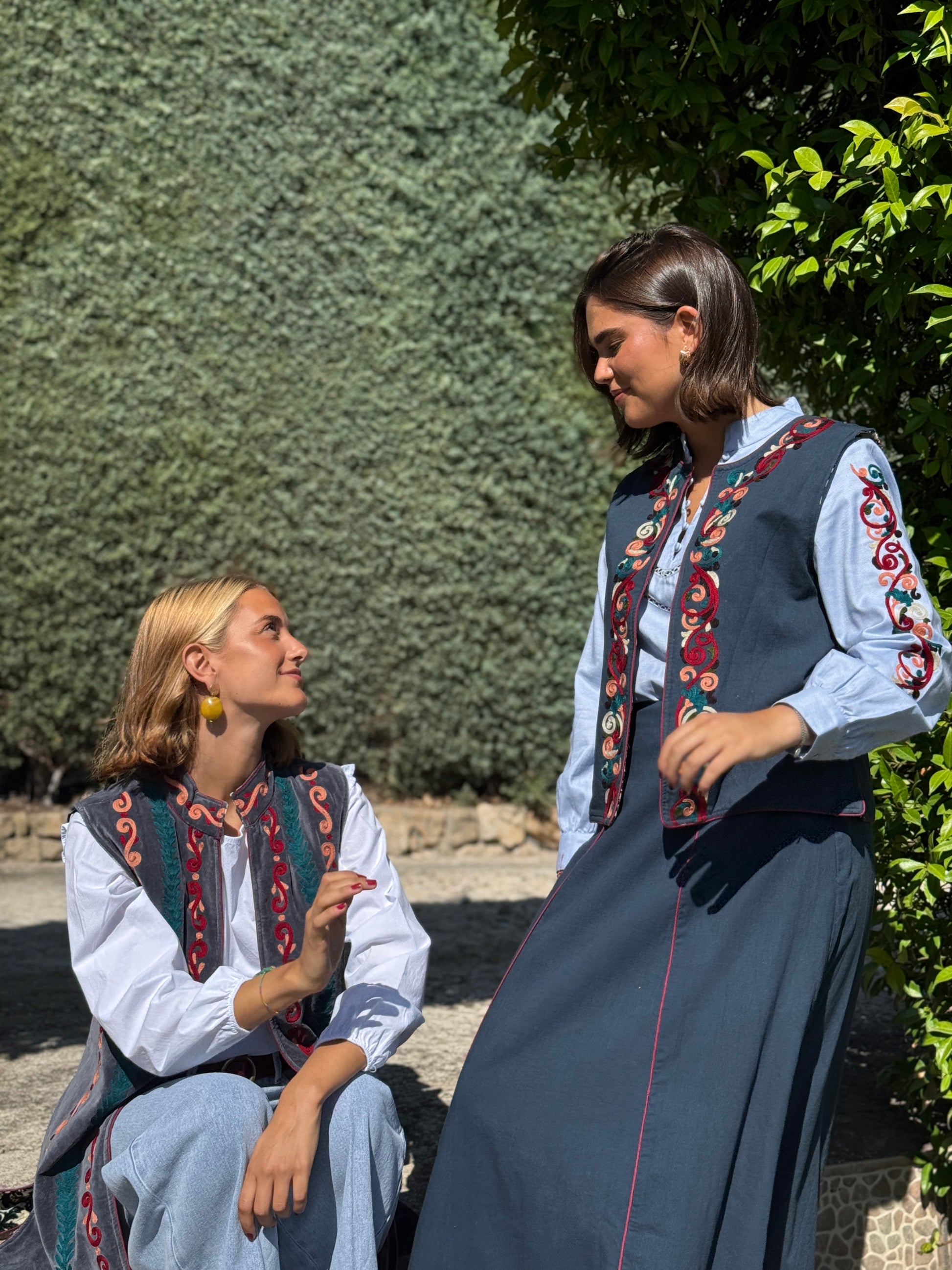 Chaleco 100% diseñado y confeccionado artesanalmente. Con una tela muy especial y un color único muy de moda, resalta por su bordado hecho a mano con colores de tendencia y por ser reversible. En la parte interior podrás encontrar un terciopelo bordado ideal para combinar con cualquier look. Ideal tanto para tus outfits mas informales con tus jeans preferidos, como para ir arreglada a cualquier ocasión especial. Una prenda única que no dejará indiferente a nadie. Disponible en varias tallas. La modelo viste la talla M.