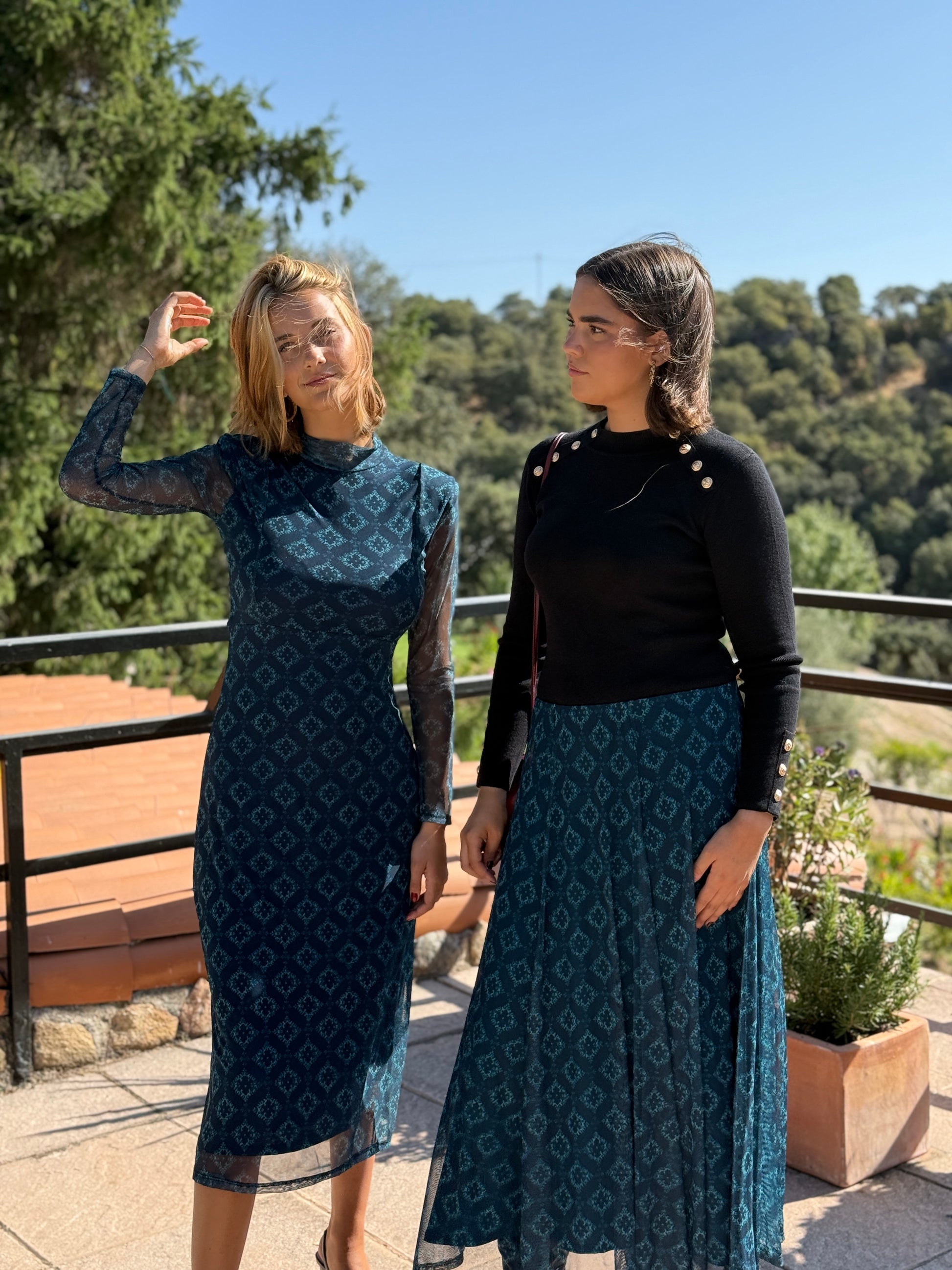 Falda midi de tul en color azul pavo, con elástico en la cintura. Es una falda con vuelo con una caída ideal que realza mucho la figura. El elástico de la cintura te permite vestirla en la posición que mejor se adapte a tu figura. Tiene un color y estampado espectacular. Muy versátil ya que podrás utilizarla para tus looks mas desenfadados y para tus looks más formales. Disponible en varias tallas.