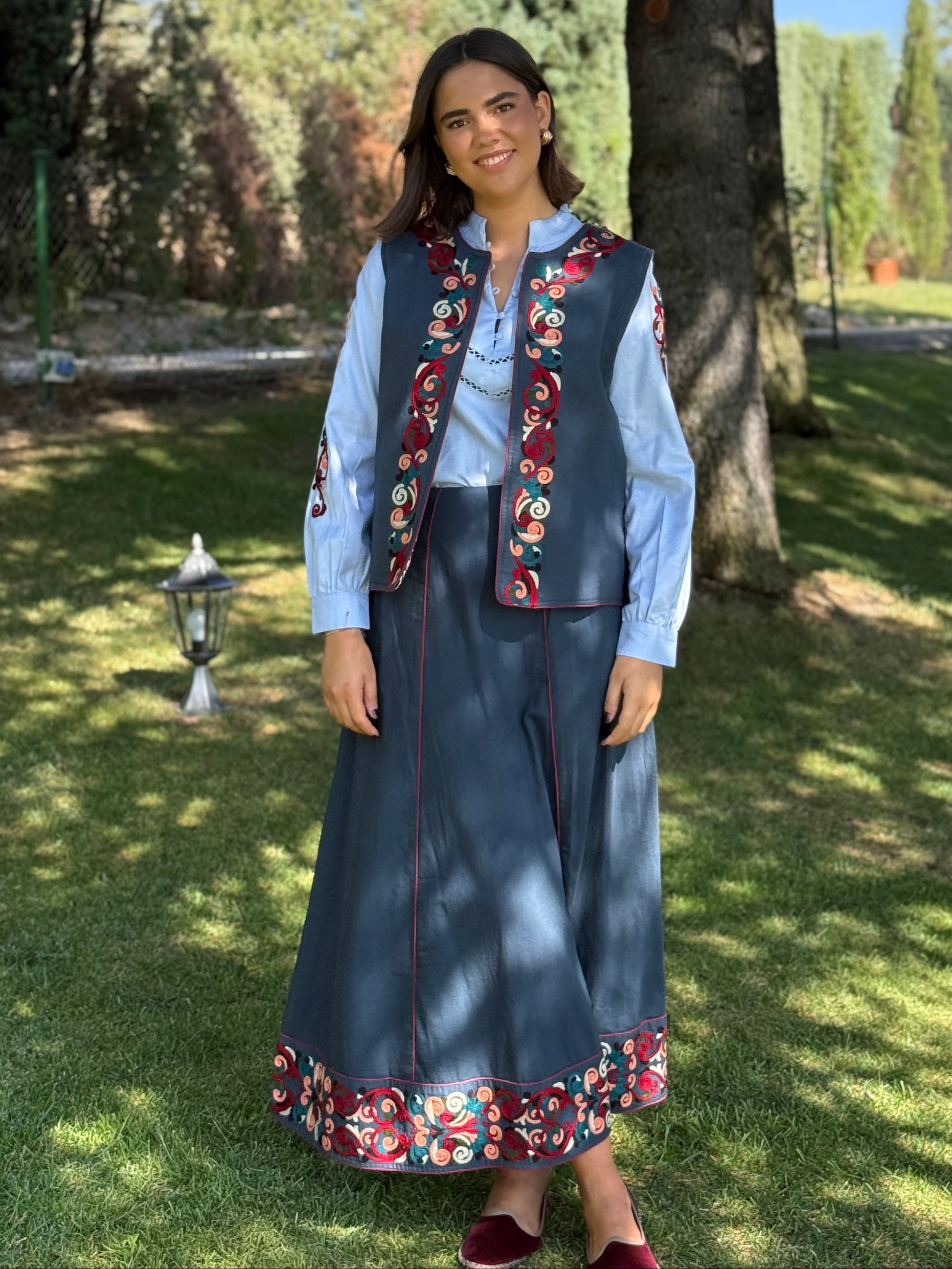Falda confeccionada 100% en algodón, de talle alto o bajo. Con forro y cremallera lateral. Una falda única con un vuelo espectacular y un color y diseño únicos que hará que no pases desapercibida. El bordado, hecho a mano, en el bajo es un diseño exclusivo con colores totalmente en tendencia. Muy versátil para tus looks de diario y para tus eventos más elegantes. Ideal para combinar con las prendas de nuestra colección Exclusive. Disponible en varias tallas. La modelo viste la talla M.