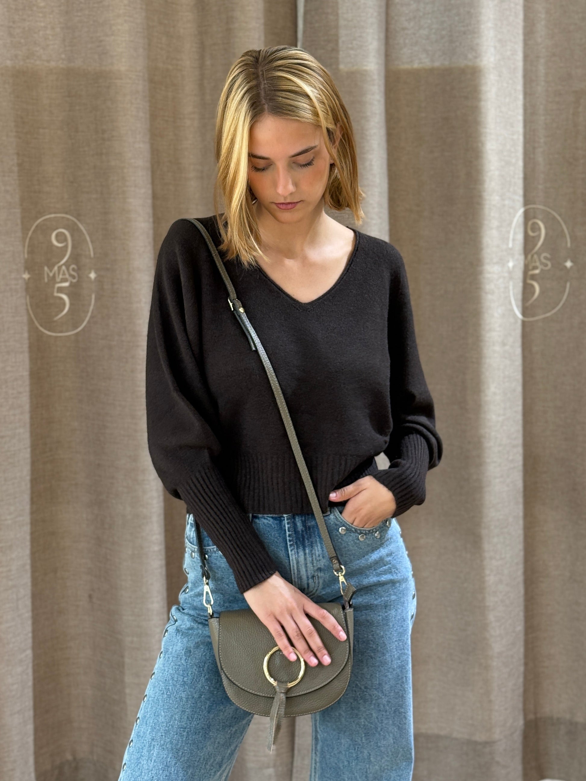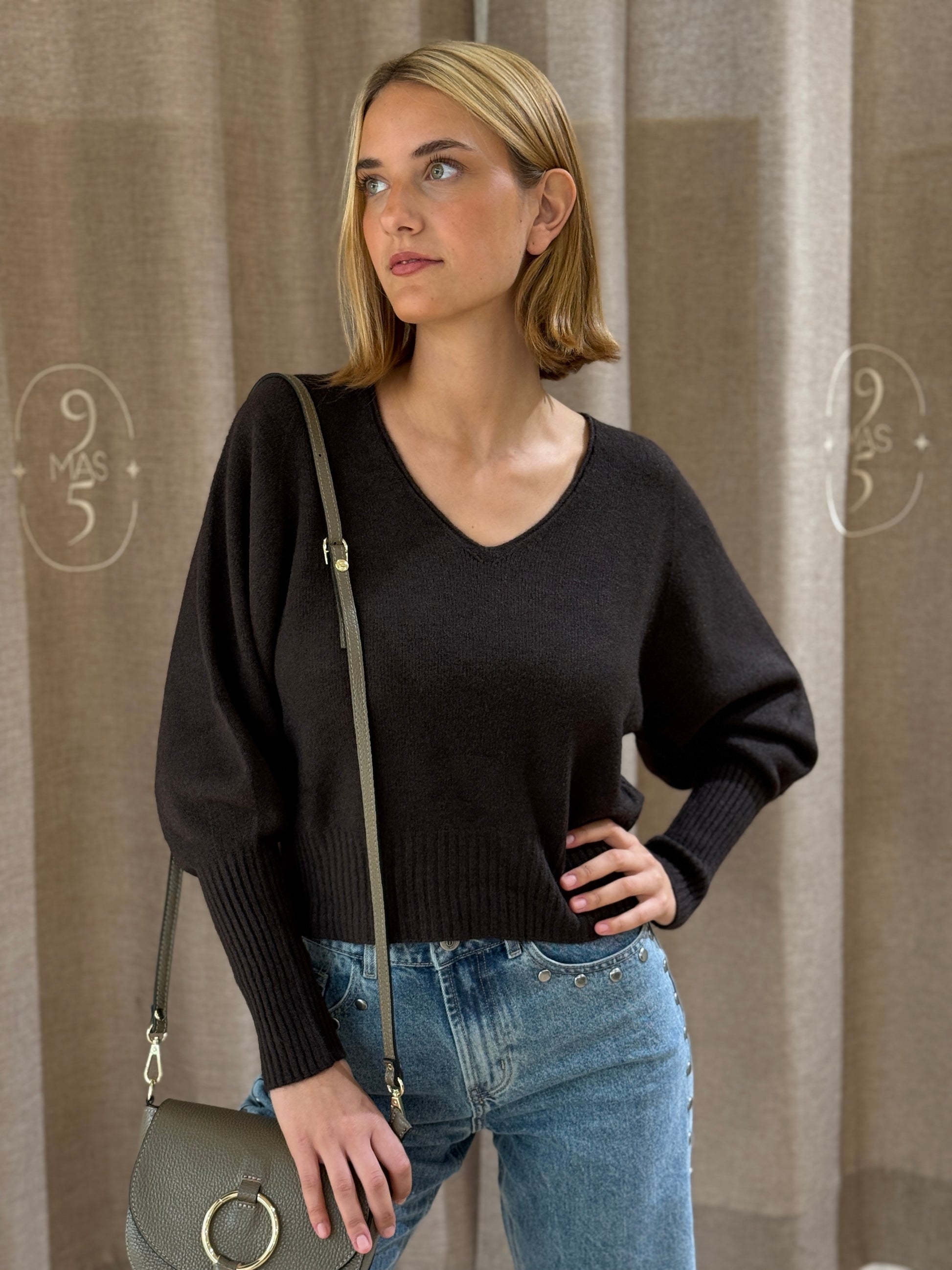 Jersey cuello pico con manga abullonada muy favorecedora. Ideal para todos tus outfits de diario y para combinar con pantalones de tiro alto y medio y faldas. Muy agradable al tacto. Talla única.