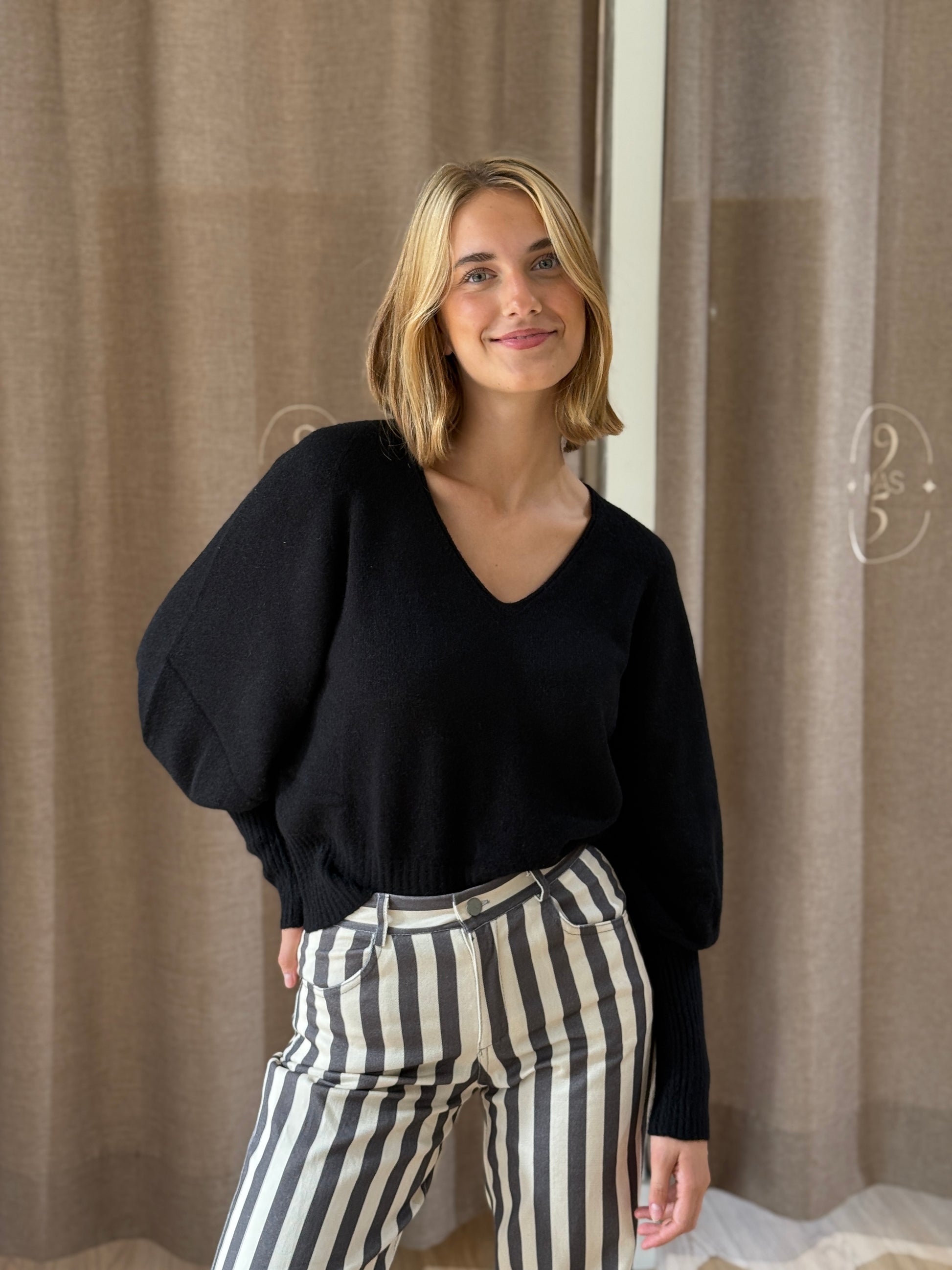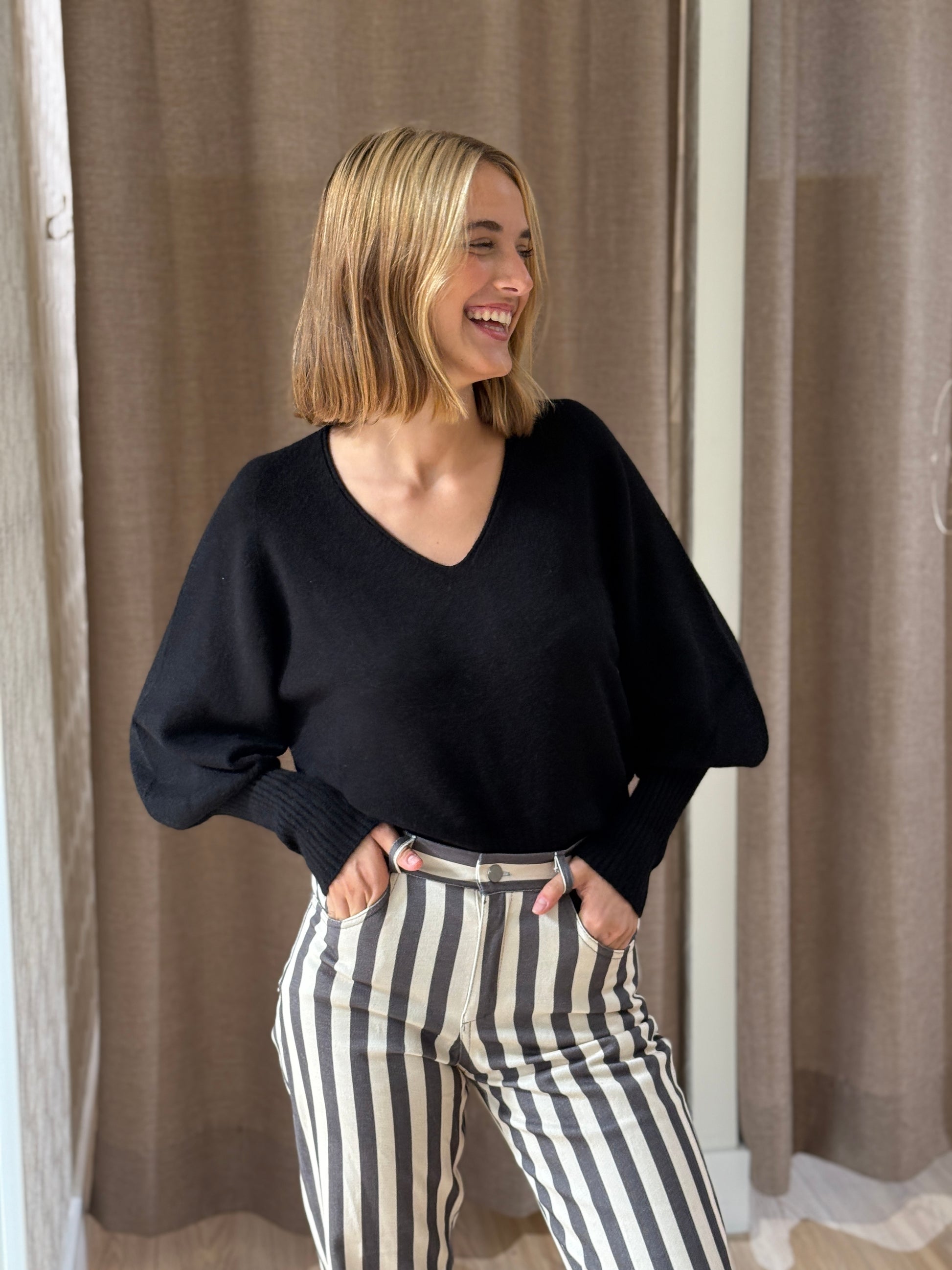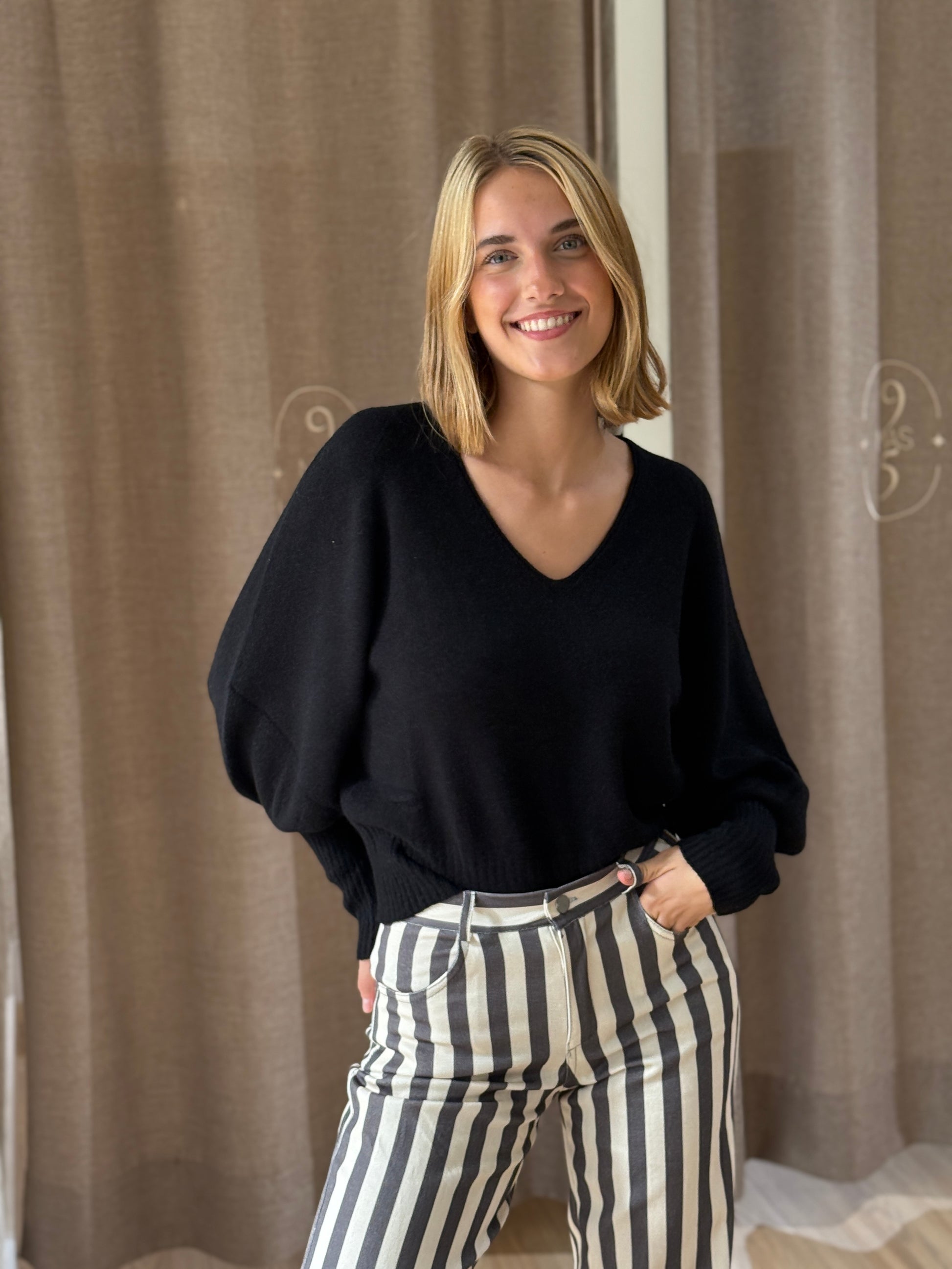 Jersey cuello pico con manga abullonada muy favorecedora. Ideal para todos tus outfits de diario y para combinar con pantalones de tiro alto y medio y faldas. Muy agradable al tacto. Talla única.