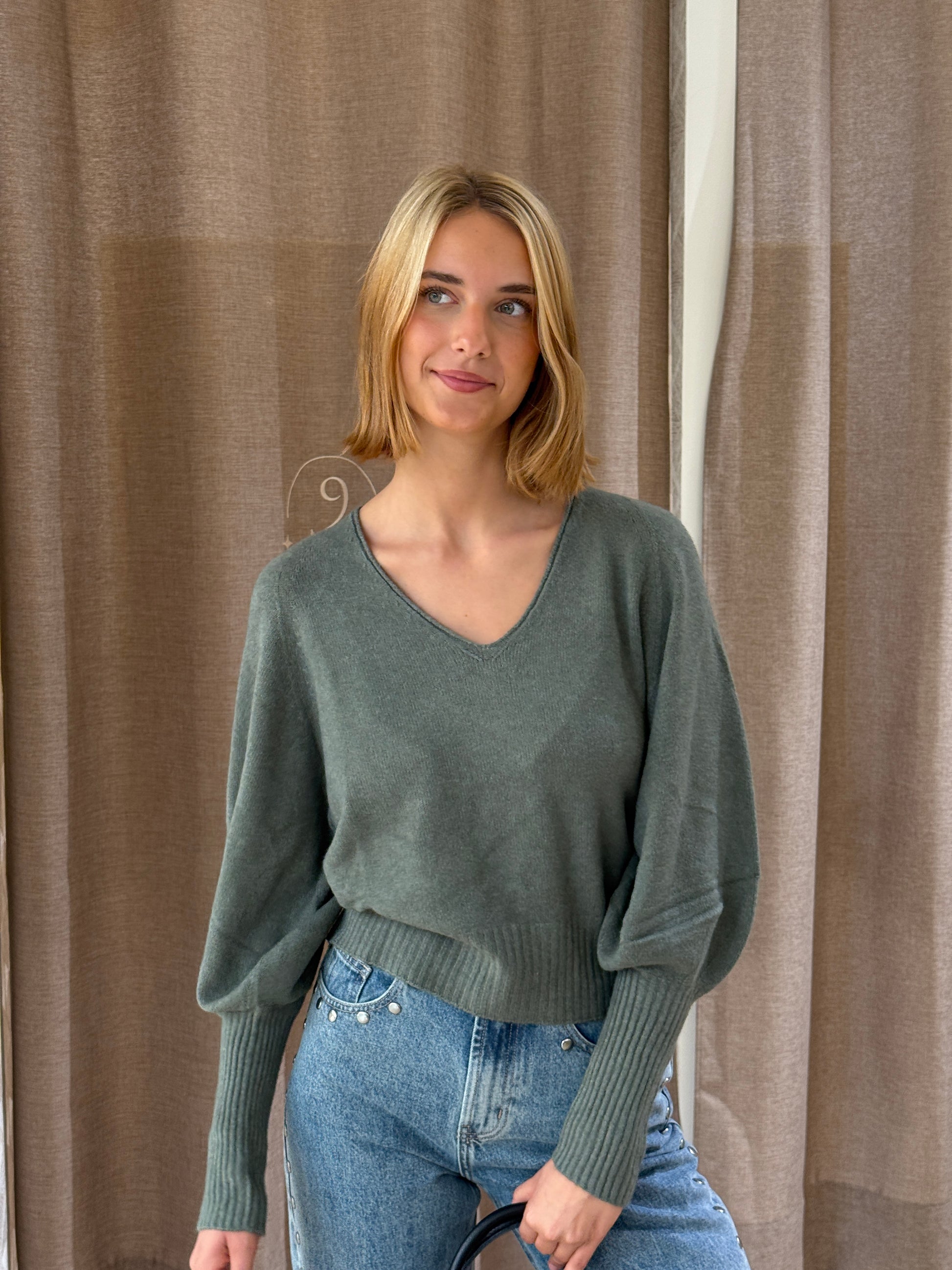 Jersey cuello pico con manga abullonada muy favorecedora. Ideal para todos tus outfits de diario y para combinar con pantalones de tiro alto y medio y faldas. Muy agradable al tacto. Talla única.