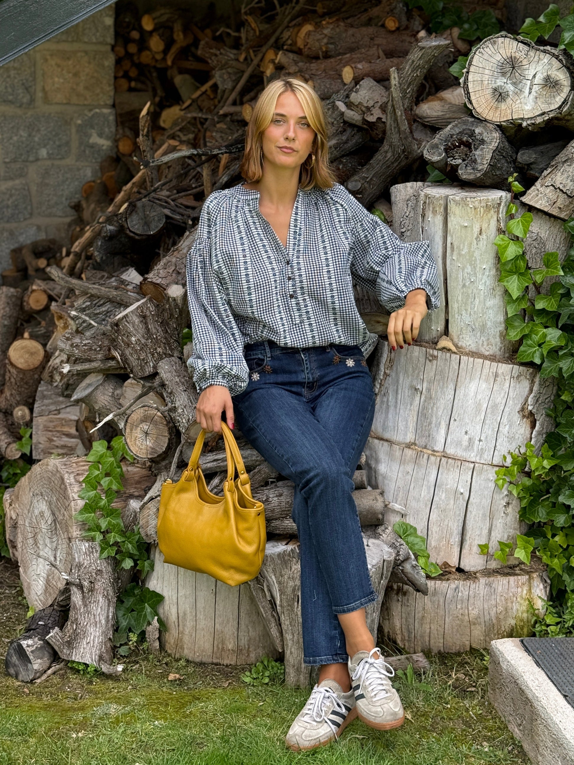 Pantalón pitillo recto tobillero, en tono vaquero oscuro, elástico y con bordados en los bolsillos en tonalidades marrón y beige. Disponible en varias tallas.