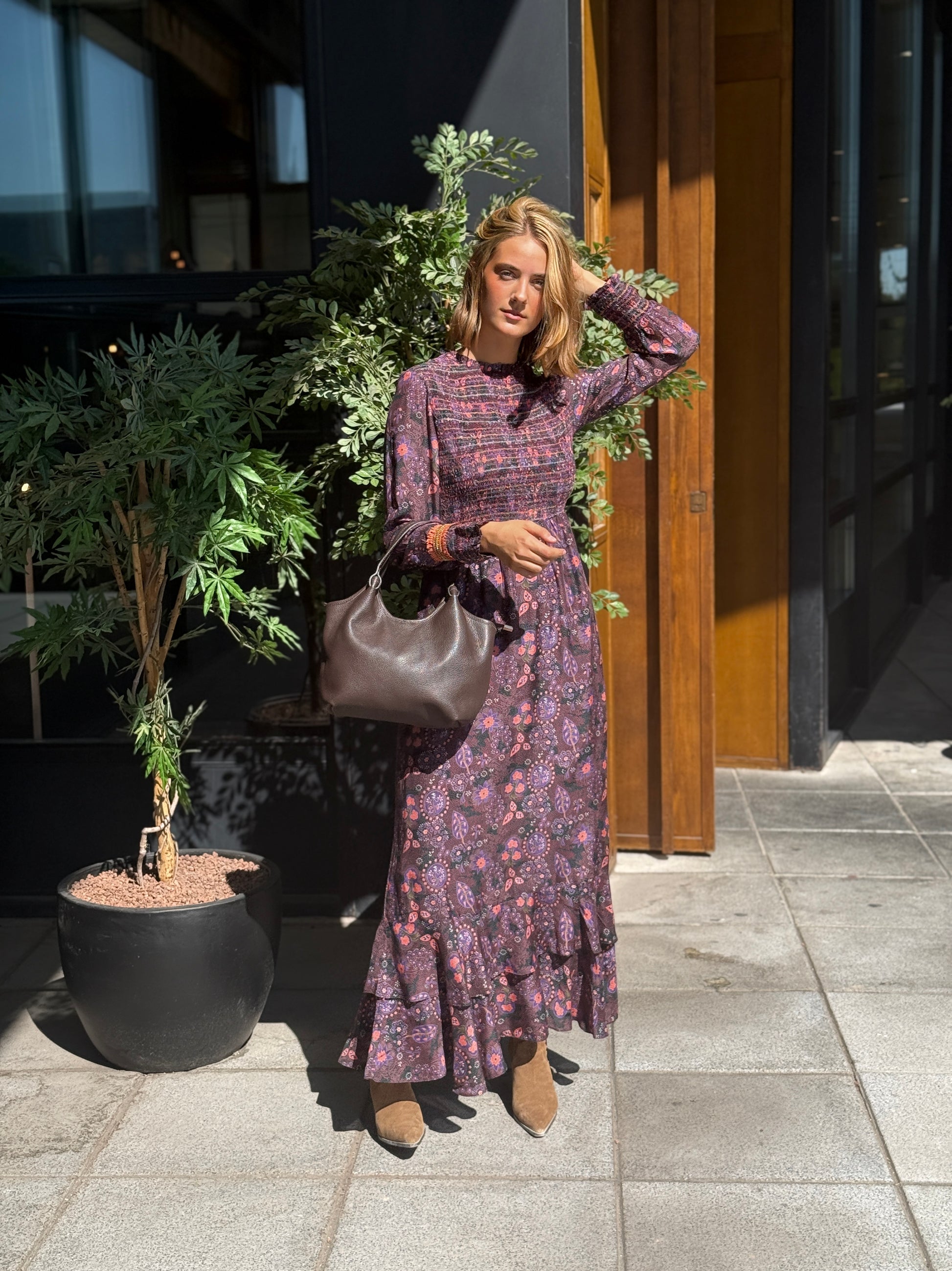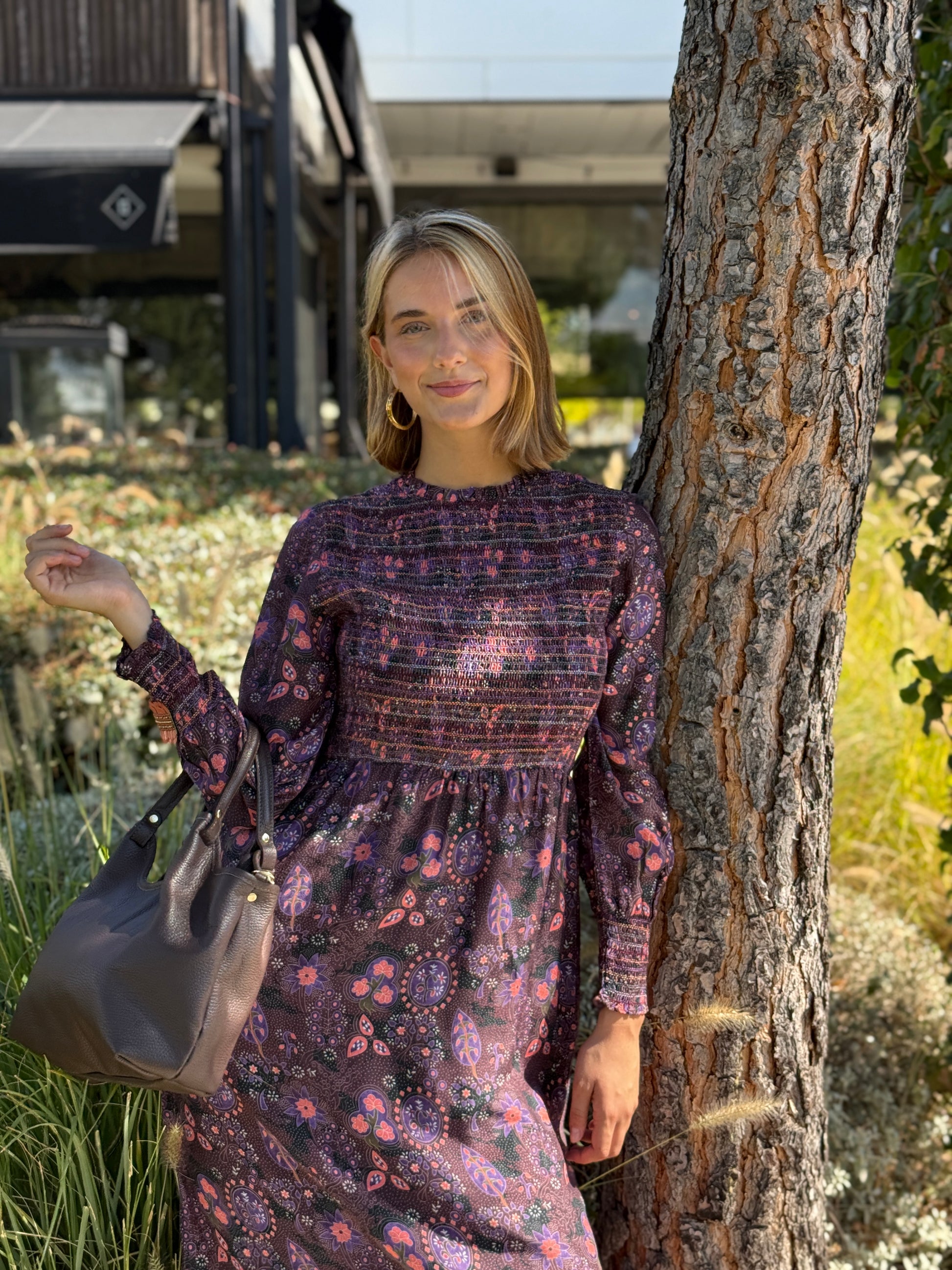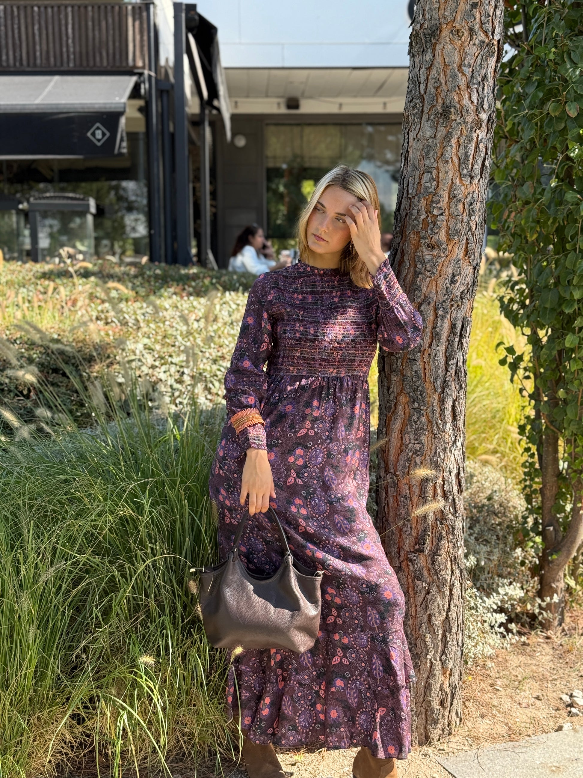 Vestido largo hasta los pies, confeccionado en algodón muselina, de manga larga y con nido de abeja en pecho y puños con hilos en los mismos colores que el vestido. Un vestido cómodo, estilo boho, ideal para combinar con tus botas cowboy y para todos tus looks de diario. Disponible en varias tallas. La modelo viste la talla M.