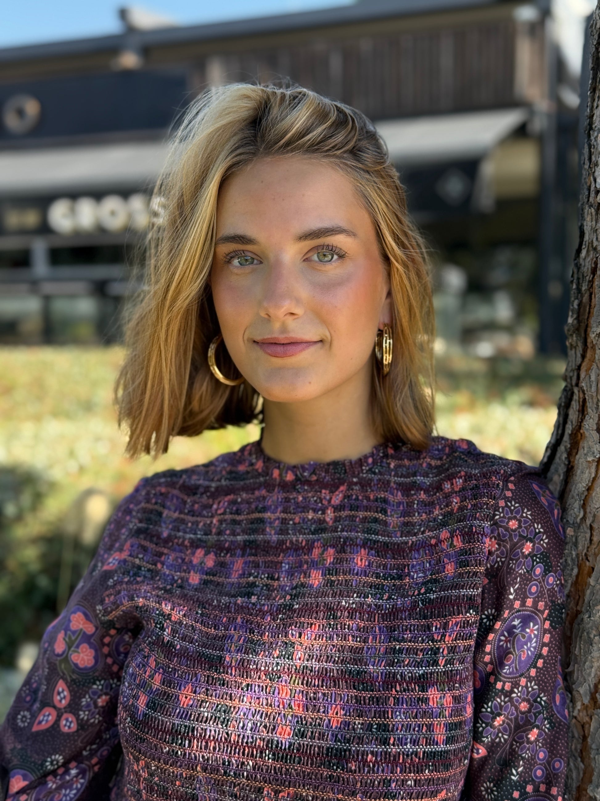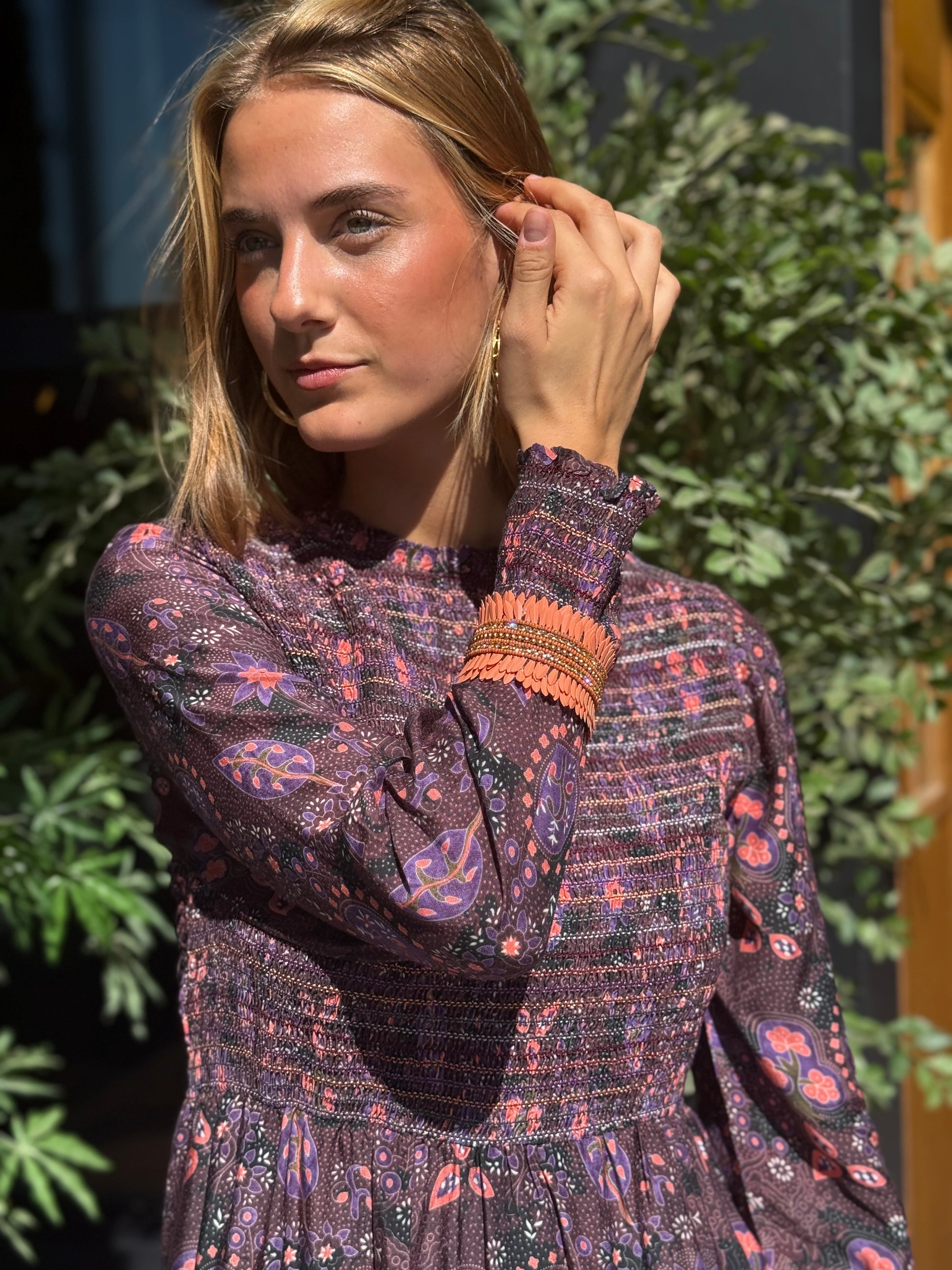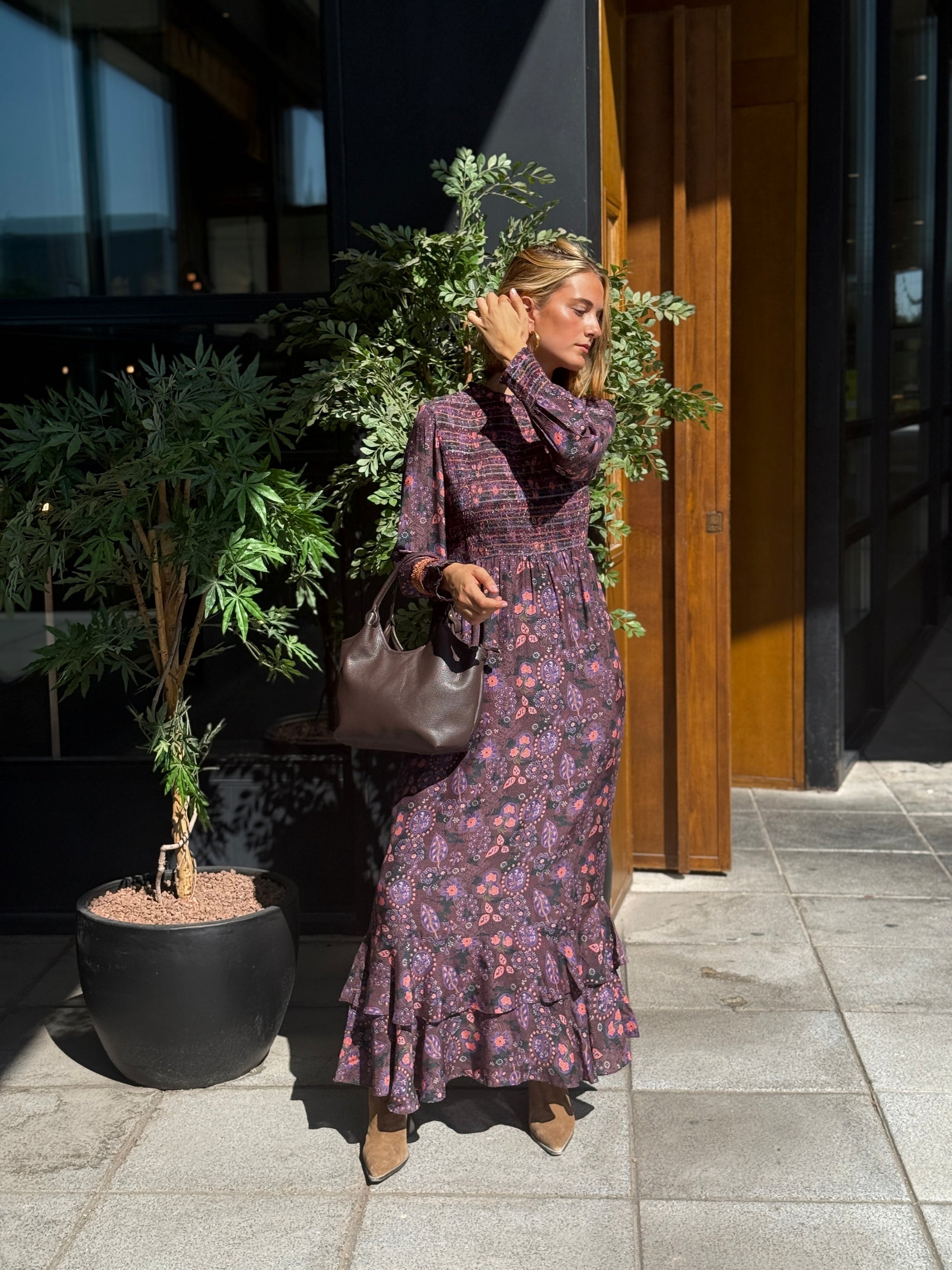 Vestido largo hasta los pies, confeccionado en algodón muselina, de manga larga y con nido de abeja en pecho y puños con hilos en los mismos colores que el vestido. Un vestido cómodo, estilo boho, ideal para combinar con tus botas cowboy y para todos tus looks de diario. Disponible en varias tallas. La modelo viste la talla M.