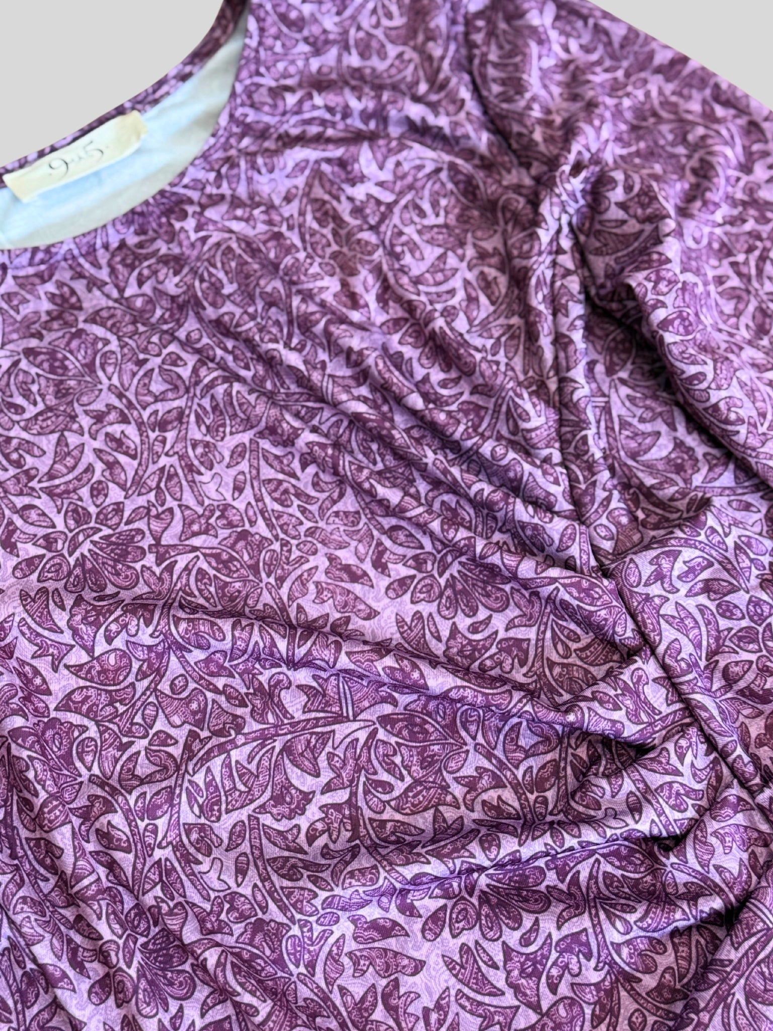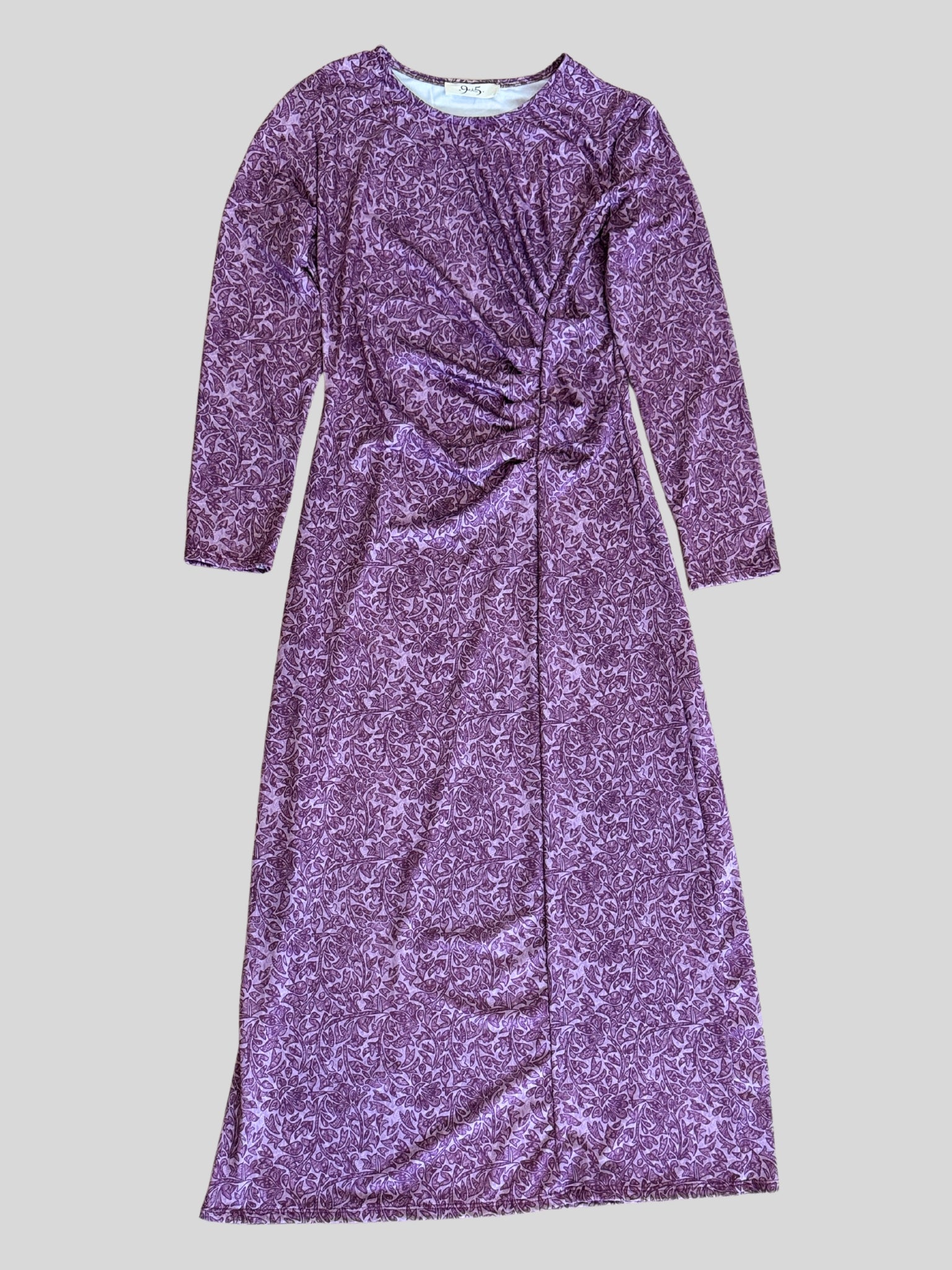 Vestido de manga larga con cuello caja confeccionado en seda fría. Largo y con drapeado en la cintura, que lo hace cómodo y súper favorecedor. Ideal para tus eventos con los complementos adecuados. Disponible en varias tallas.